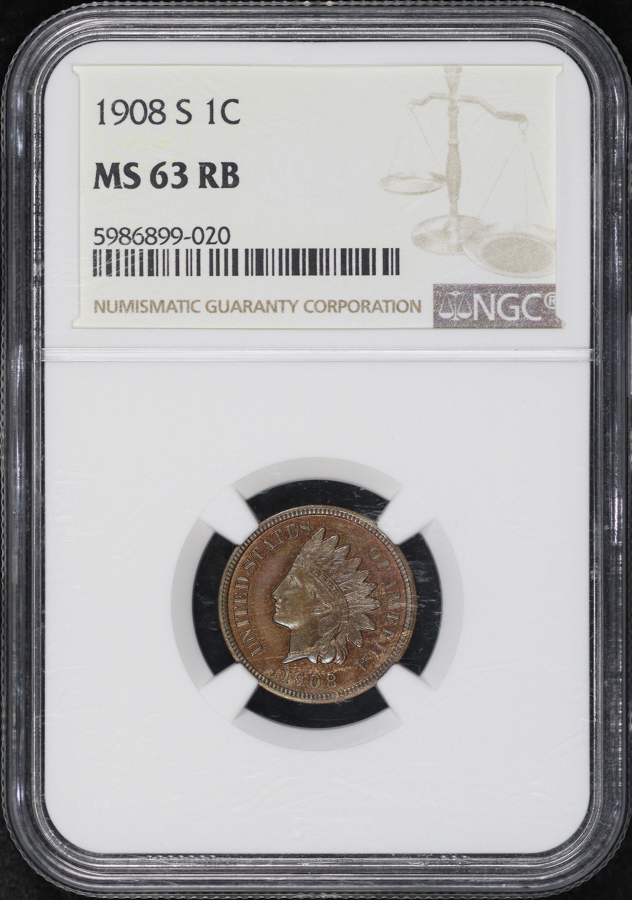 1908-S Indian Cent NGC MS-63 RB. Both sides display faint violet hue toning. There are minor scuffs and scratches on the NGC holder.