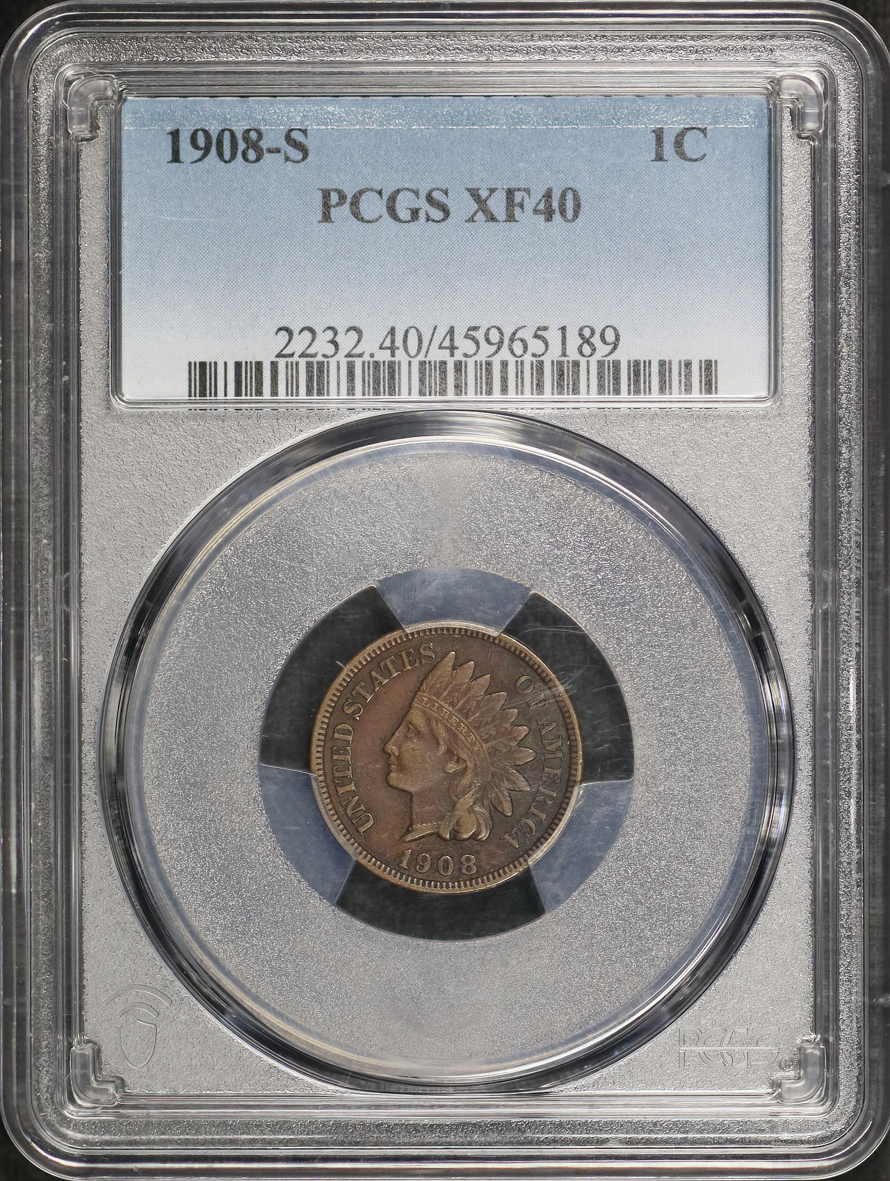 1908-S Indian Cent PCGS XF-40 BN designed by James Barton Longacre.
