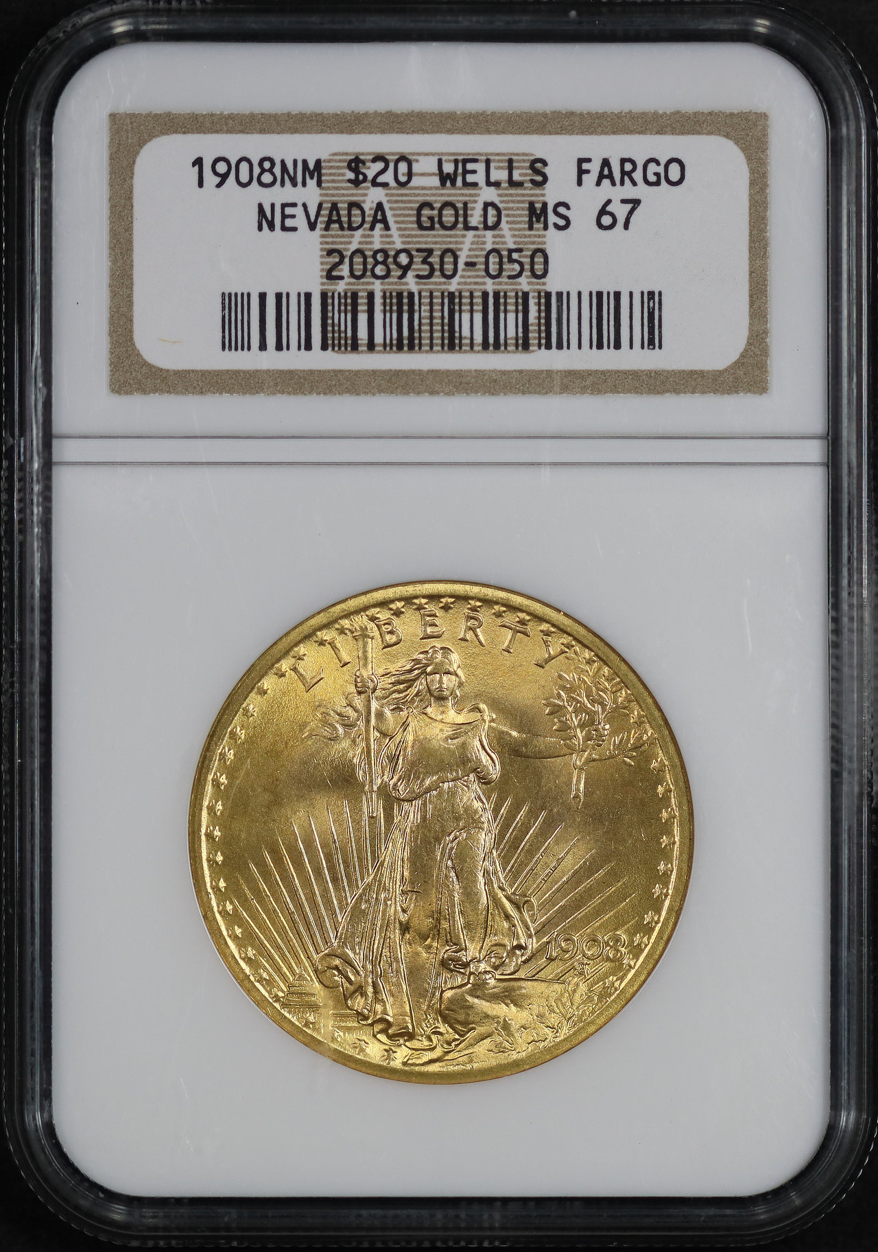 1908 St. Gaudens $20 No Motto NGC MS-67 Nevada Wells Fargo