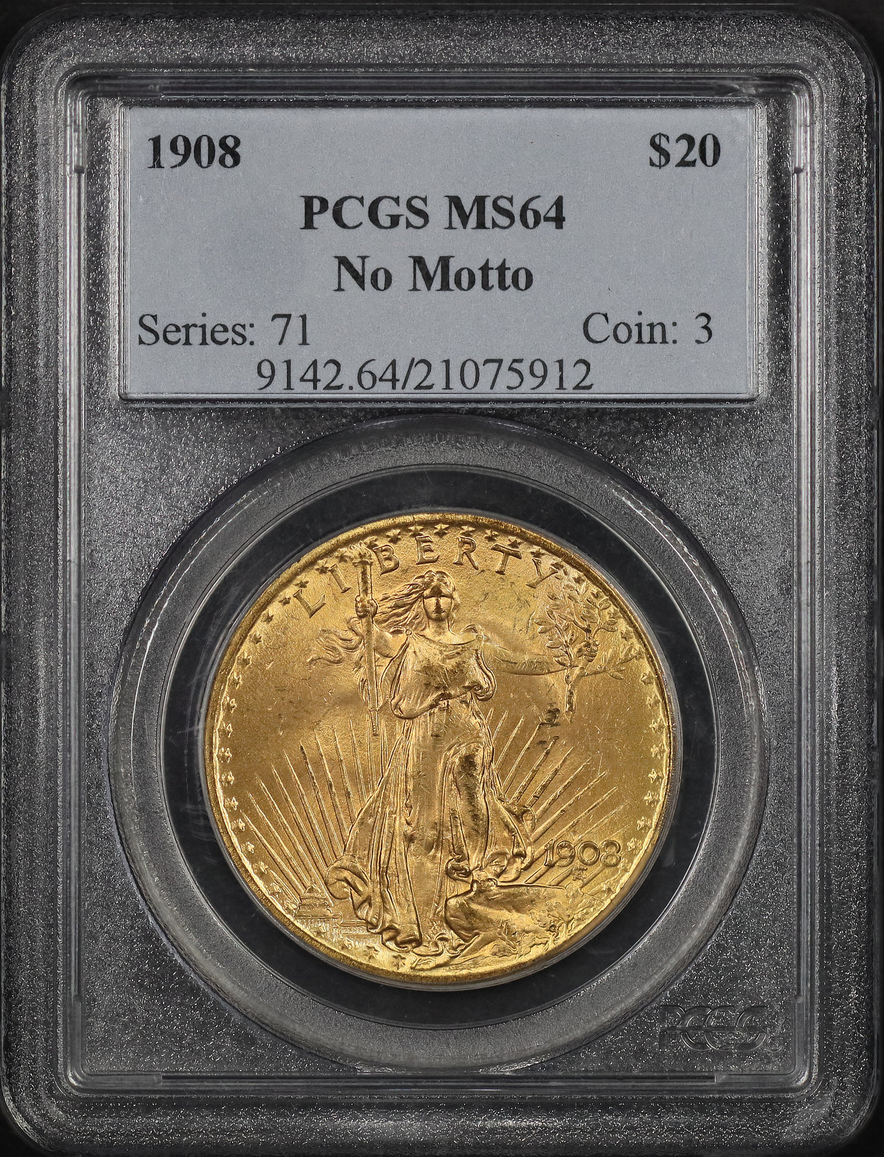1908 St. Gaudens $20 No Motto PCGS MS-64 designed by Augustus Saint Gaudens.