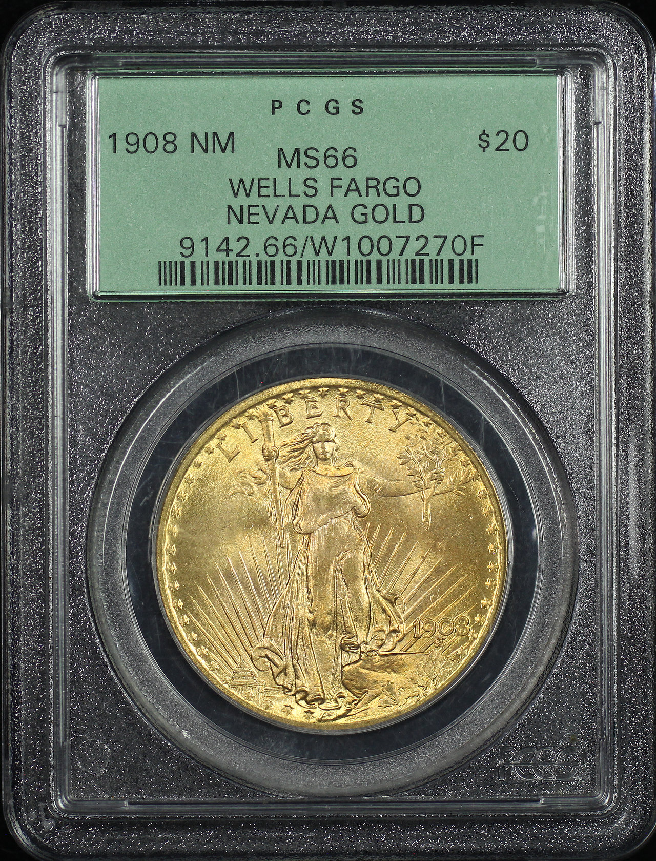 1908 NM St. Gaudens $20 No Motto PCGS MS-66 Nevada Wells Fargo Hoard Old Green Holder