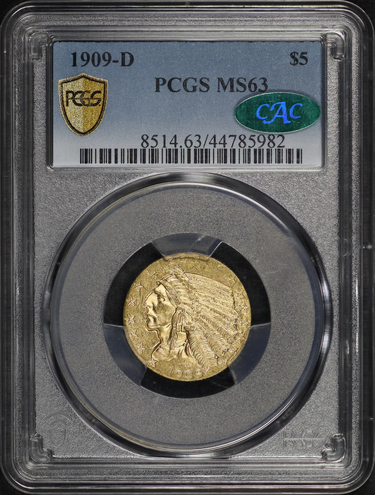 1909-D Indian $5 PCGS MS-63 CAC designed by Bela Lyon Pratt.