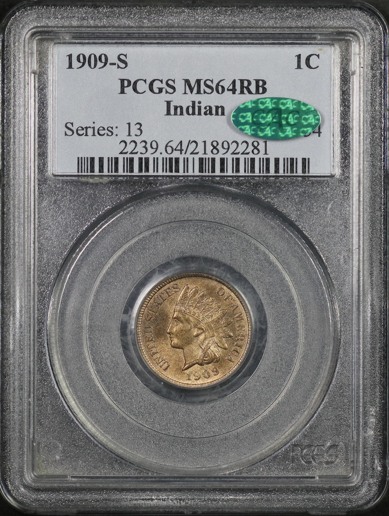 1909-S Indian Cent PCGS MS-64 RB CAC designed by James Barton Longacre.