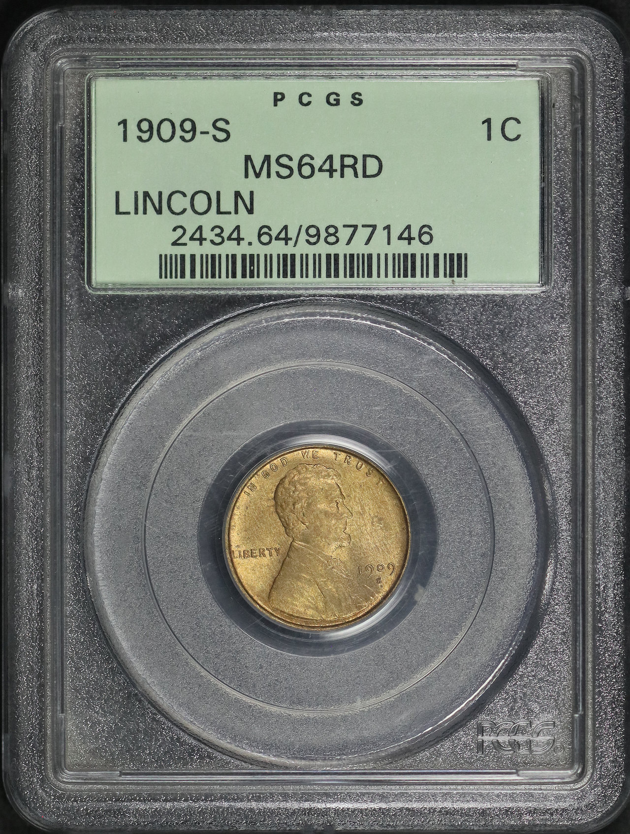 1909-S Lincoln Cent Wheat Reverse PCGS MS-64 RD Old Green Holder designed by Victor David Brenner.