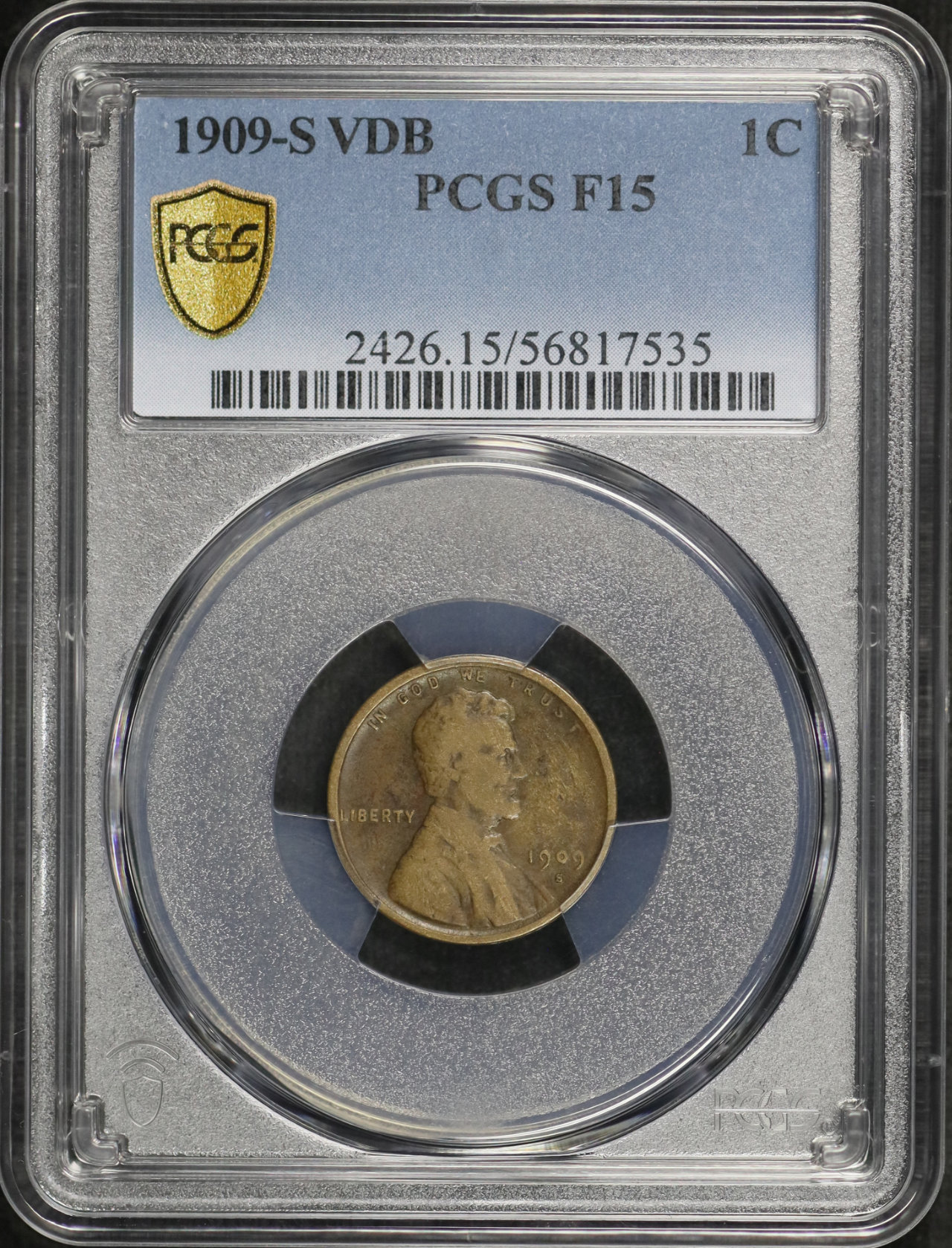 1909-S VDB Lincoln Cent Wheat Reverse PCGS F-15 designed by Victor David Brenner.