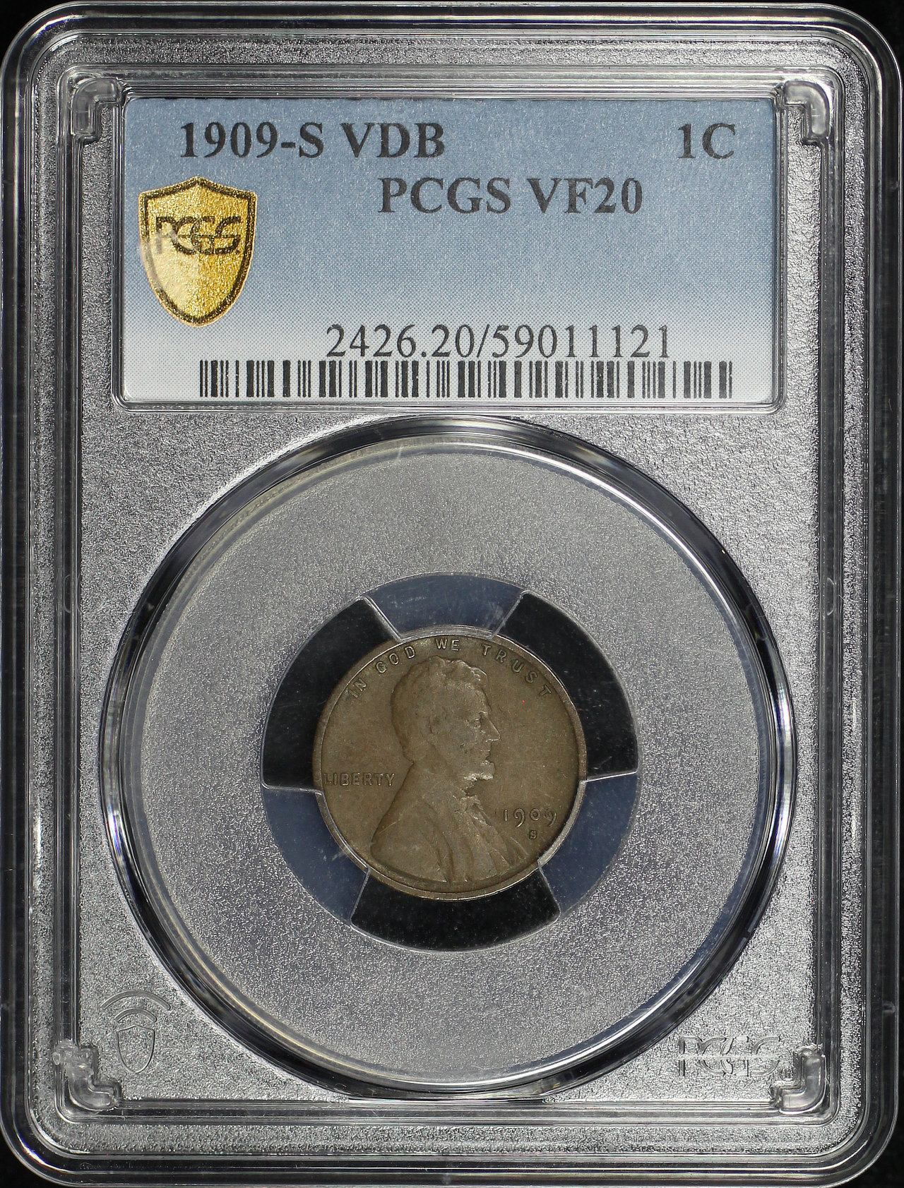 1909-S VDB Lincoln Cent Wheat Reverse PCGS VF-20 BN designed by Victor David Brenner.