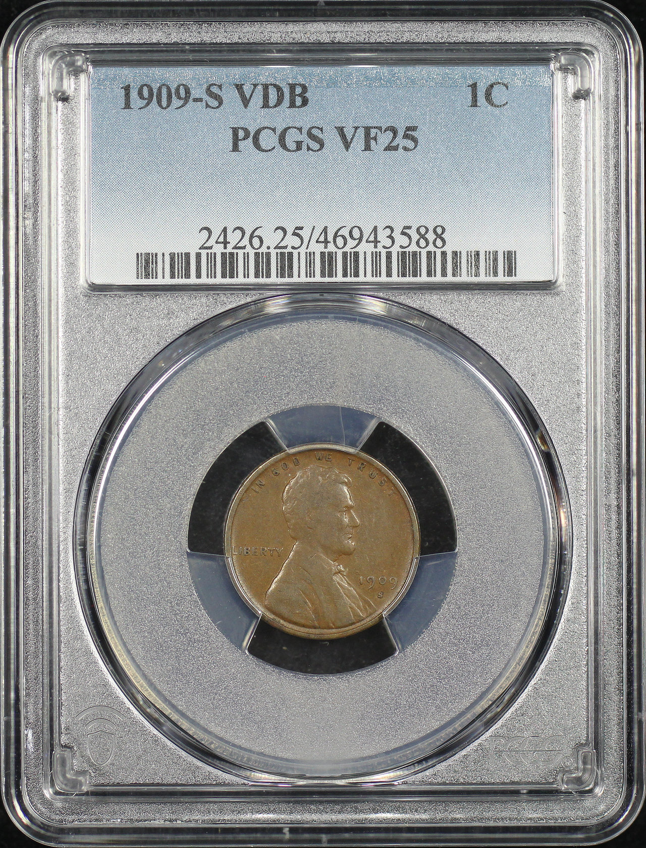 1909-S VDB Lincoln Cent Wheat Reverse PCGS VF-25 BN designed by Victor David Brenner.