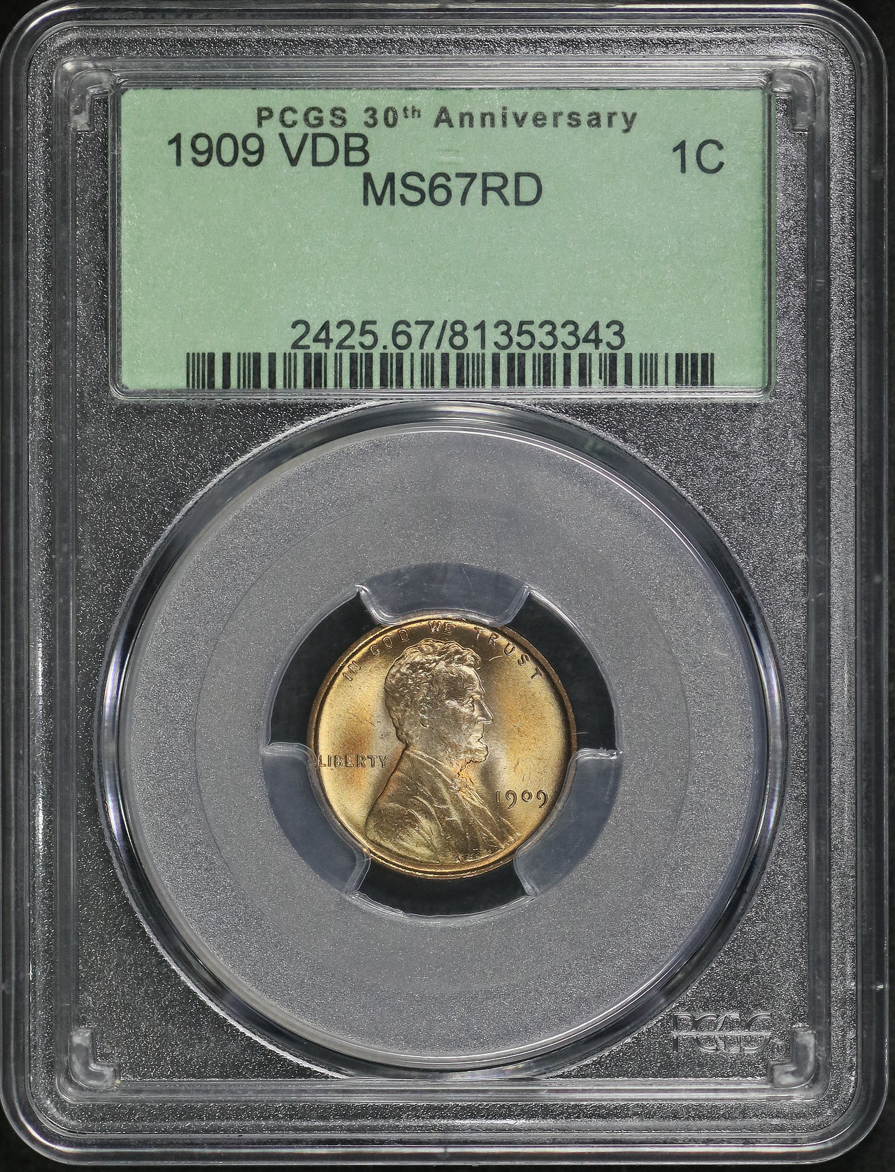 1909 VDB Lincoln Cent Wheat Reverse PCGS MS-67 RD designed by Victor David Brenner.