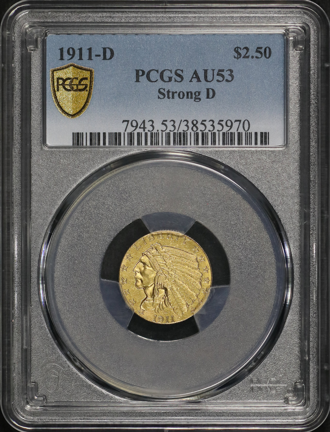 1911-D Indian Strong D $2.5 PCGS AU-53 designed by Bela Lyon Pratt.