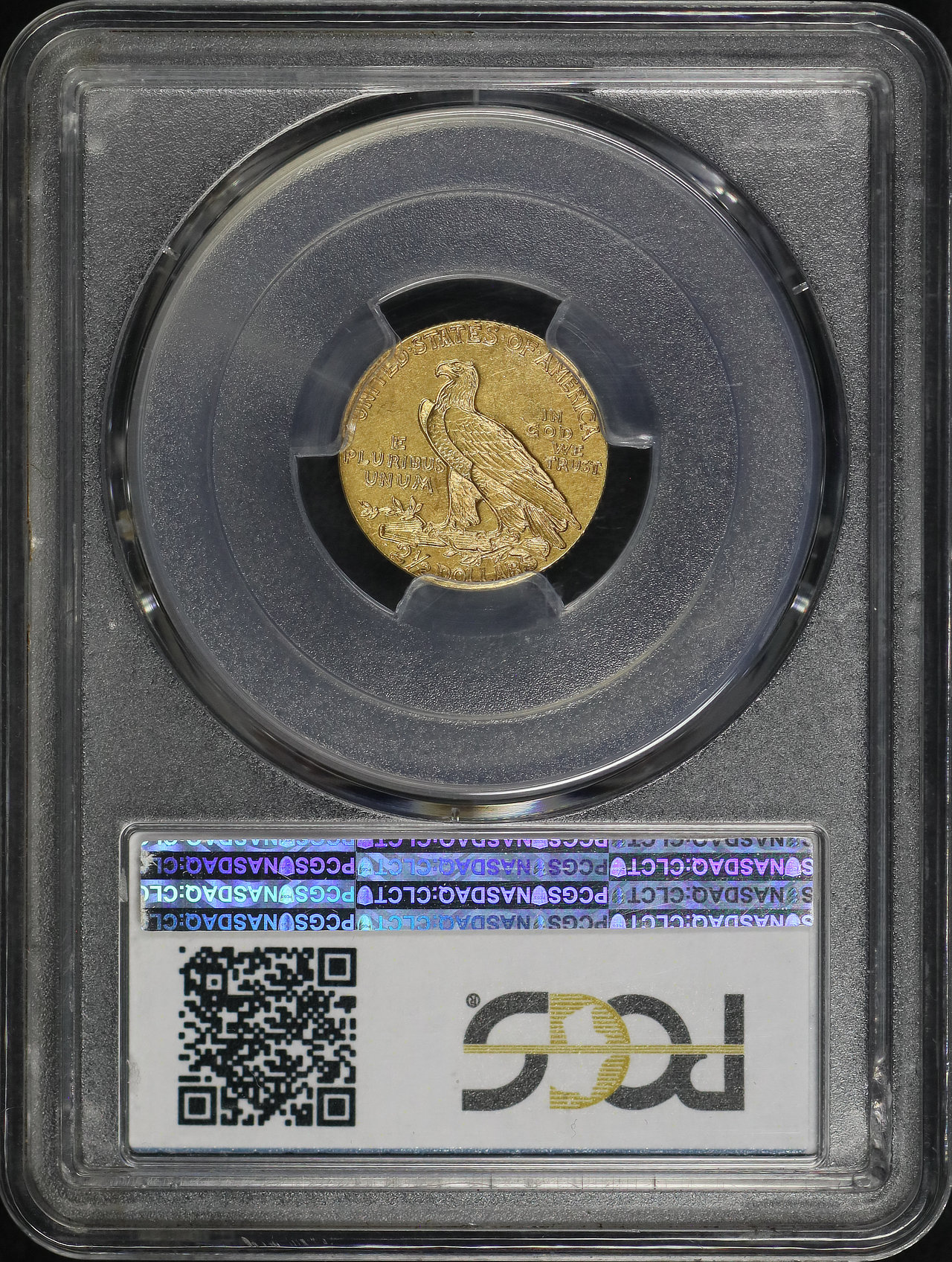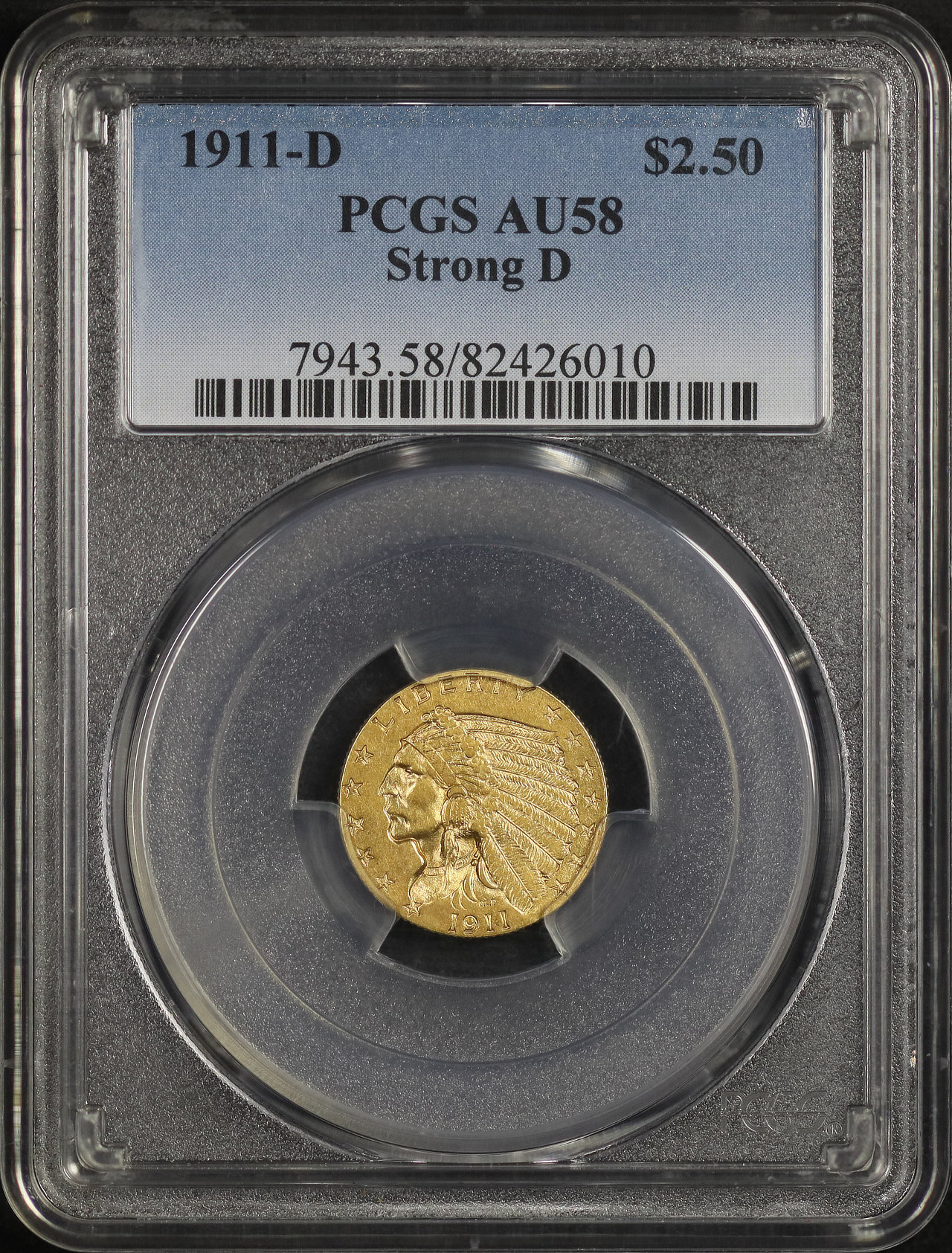 1911-D Indian $2.5 Strong D PCGS AU-58 designed by Bela Lyon Pratt.