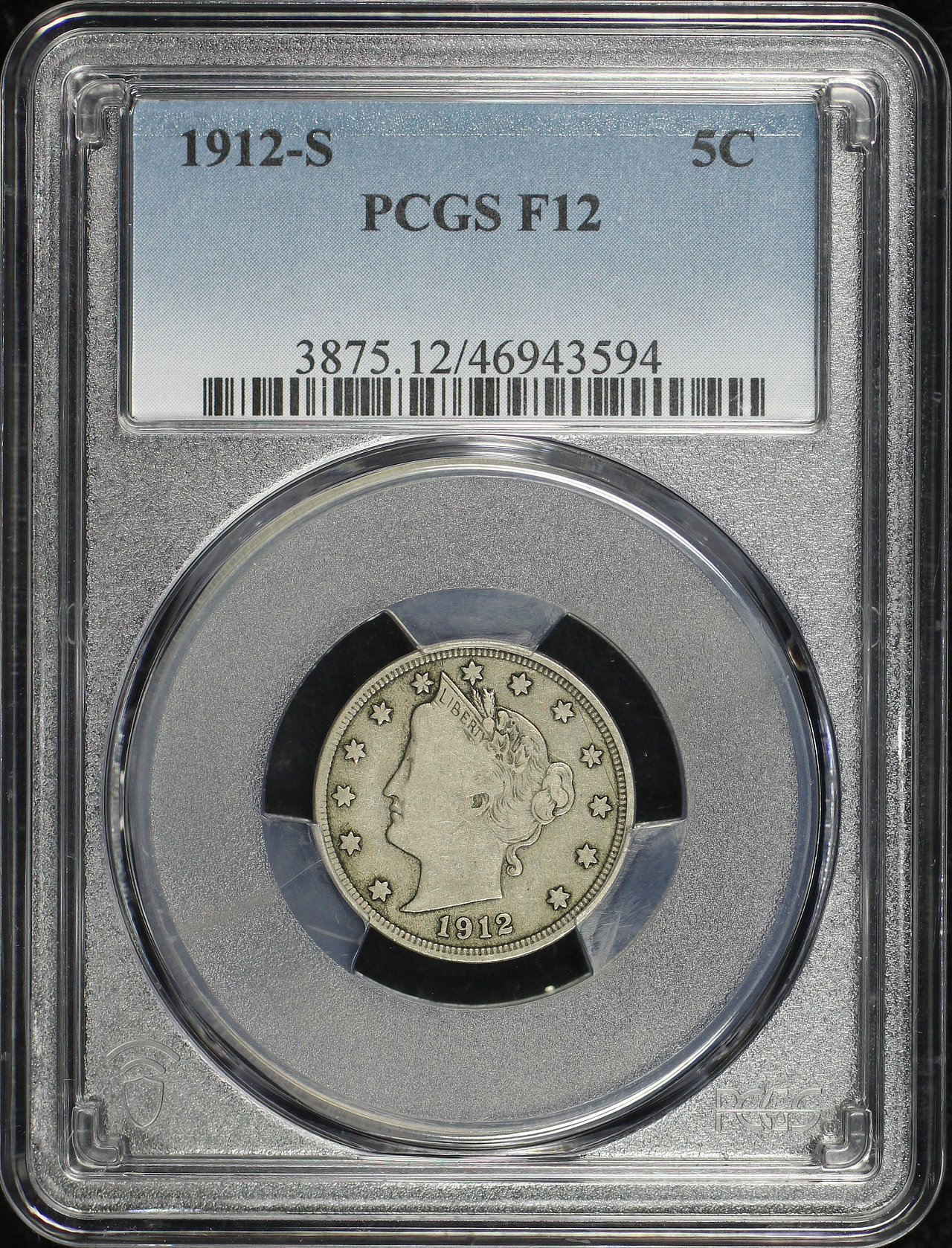 1912-S Liberty Nickel PCGS F-12 designed by Charles E. Barber.