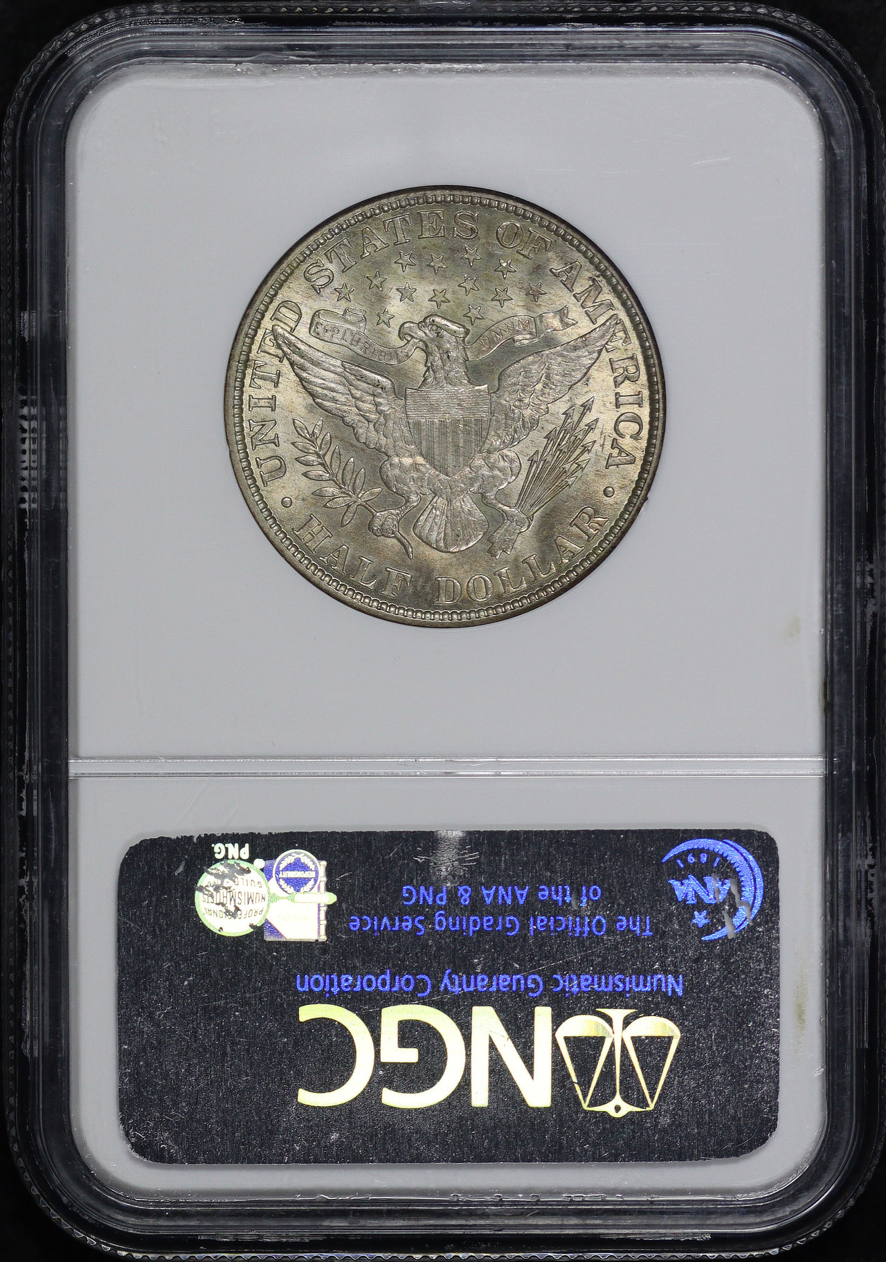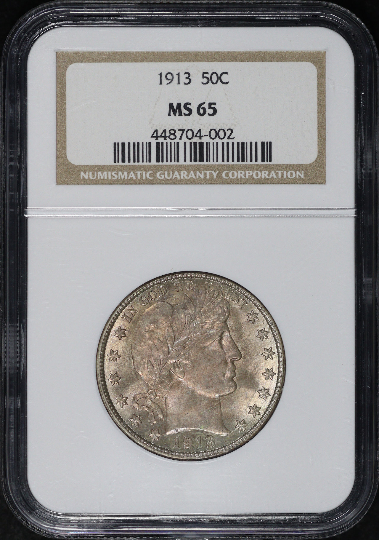 1913 Barber Half Dollar NGC MS-65. Both sides display smoky pink and honey hue toning.
