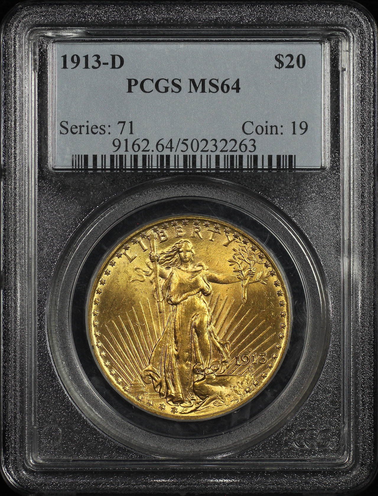1913-D St. Gaudens $20 PCGS MS-64 designed by Augustus Saint Gaudens.