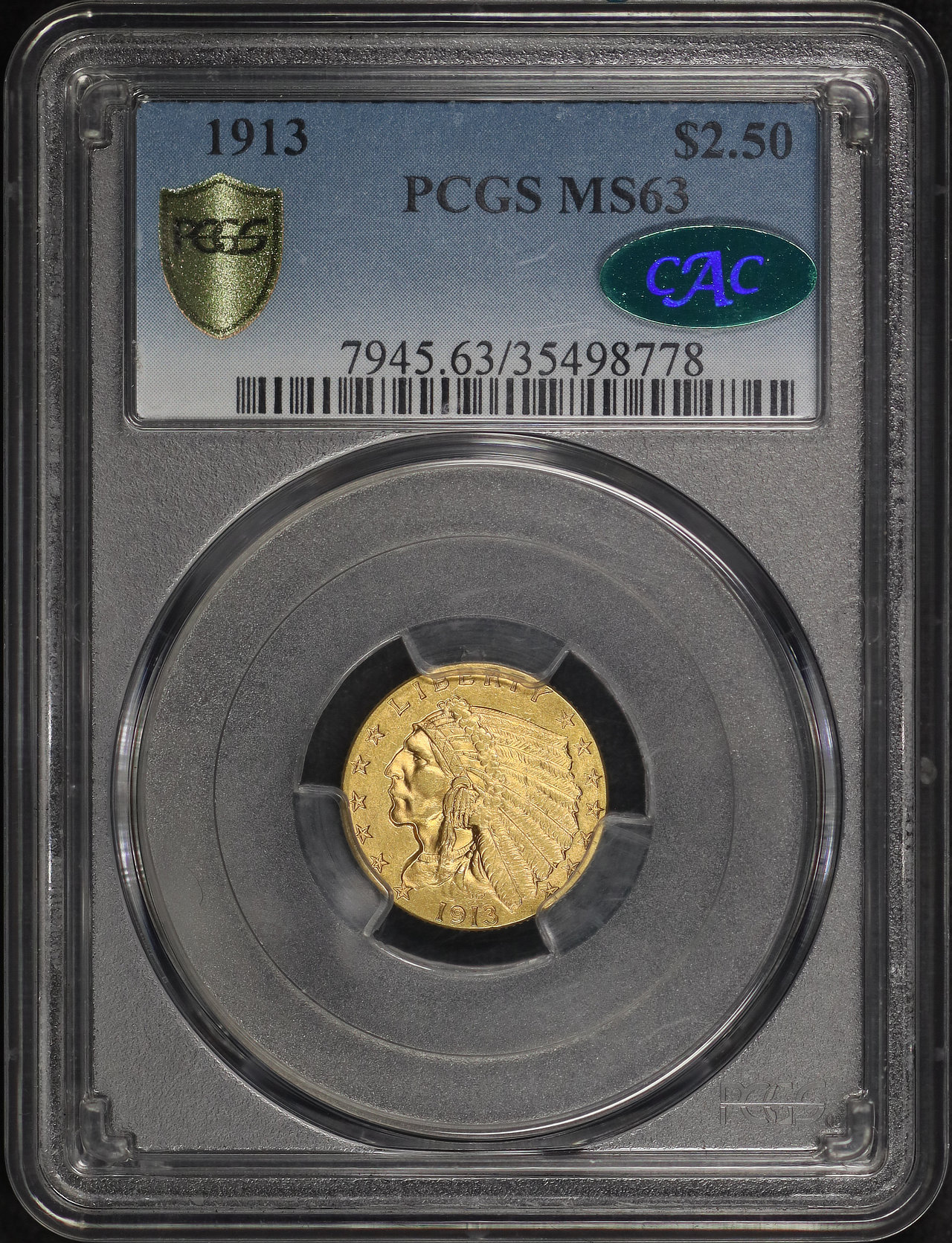 1913 Indian $2.5 PCGS MS-63 CAC designed by Bela Lyon Pratt.