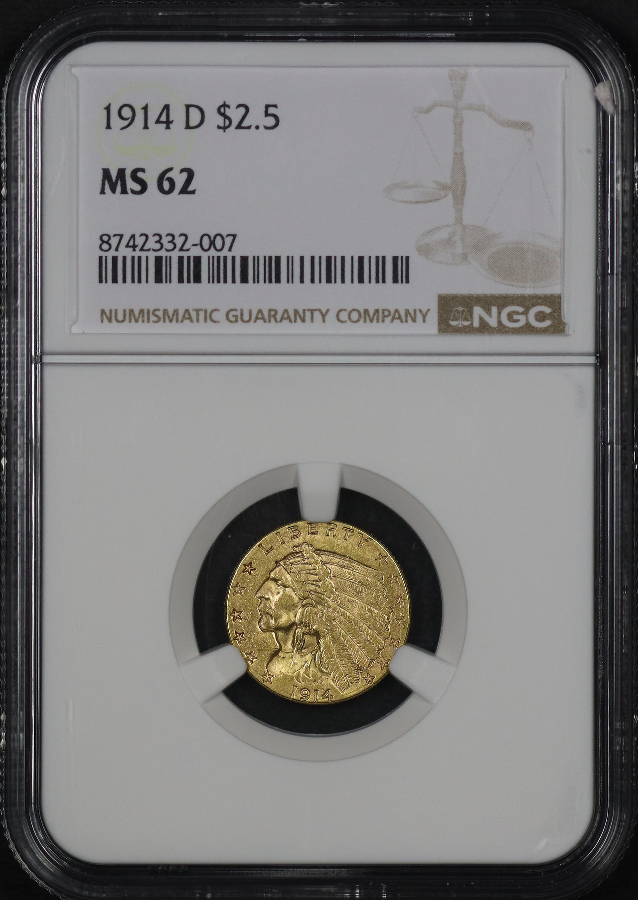 1914-D Indian $2.5 NGC MS-62.