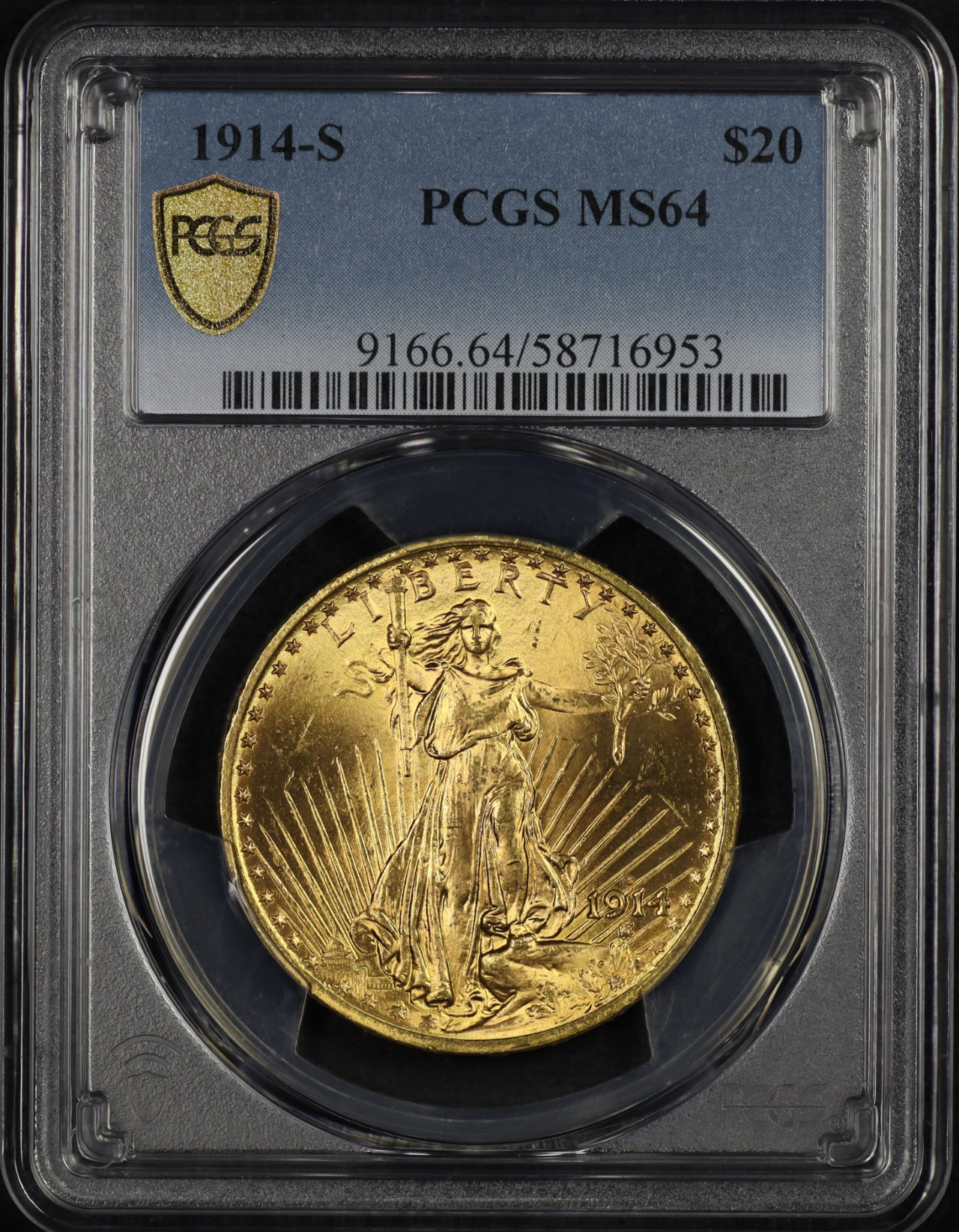 1914-S St. Gaudens $20 PCGS MS-64 designed by Augustus Saint Gaudens.