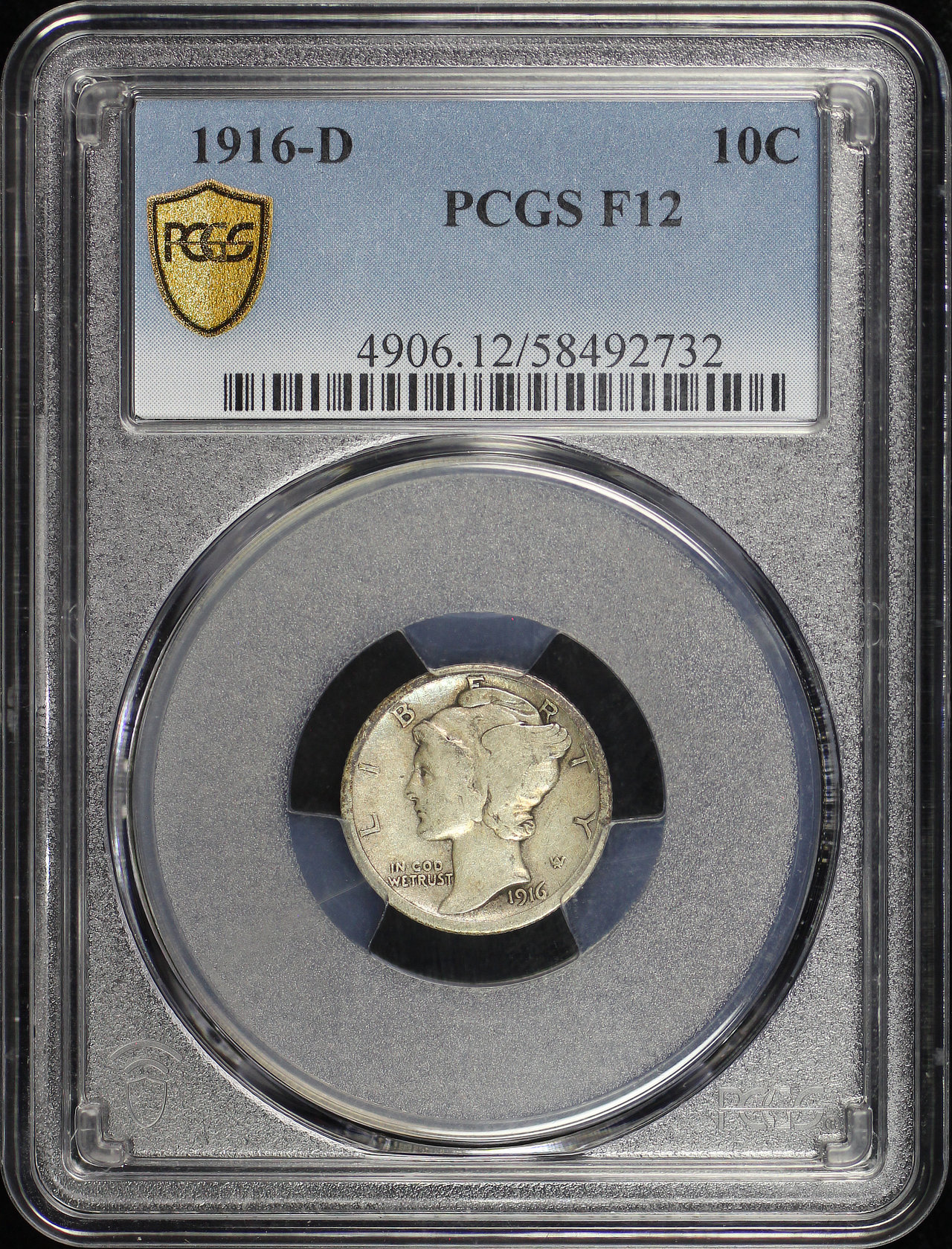1916-D Mercury Dime PCGS F-12 designed by Adolph Alexander Weinman.
