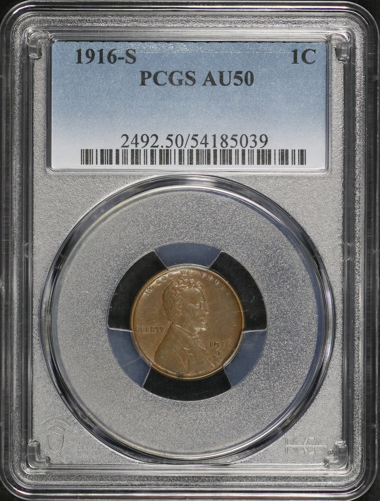 1916-S Lincoln Cent Wheat Reverse PCGS AU-50 BN designed by Victor David Brenner.