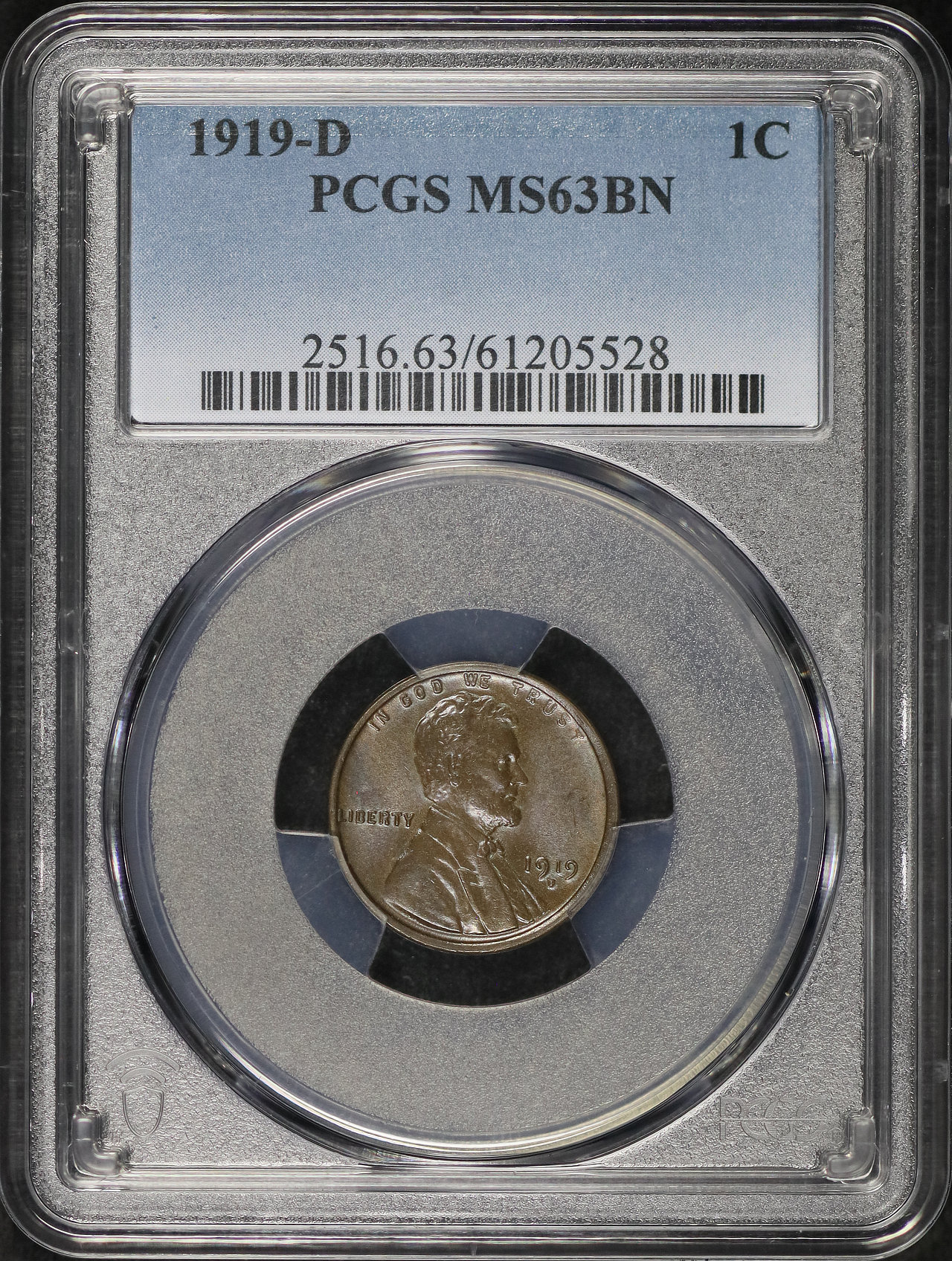 1919-D Lincoln Cent Wheat Reverse PCGS MS-63 BN designed by Victor David Brenner.
