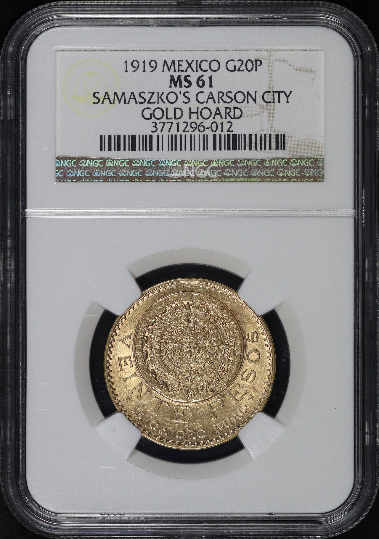 1919 Mexico Gold 20 Pesos NGC MS-61 Samaszko’s Carson City Gold Hoard Label