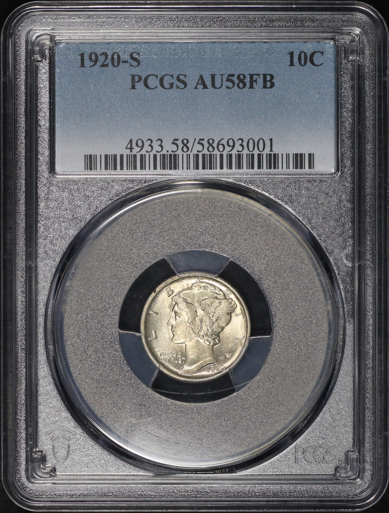 1920-S Mercury Dime PCGS AU-58 FB designed by Adolph Alexander Weinman.