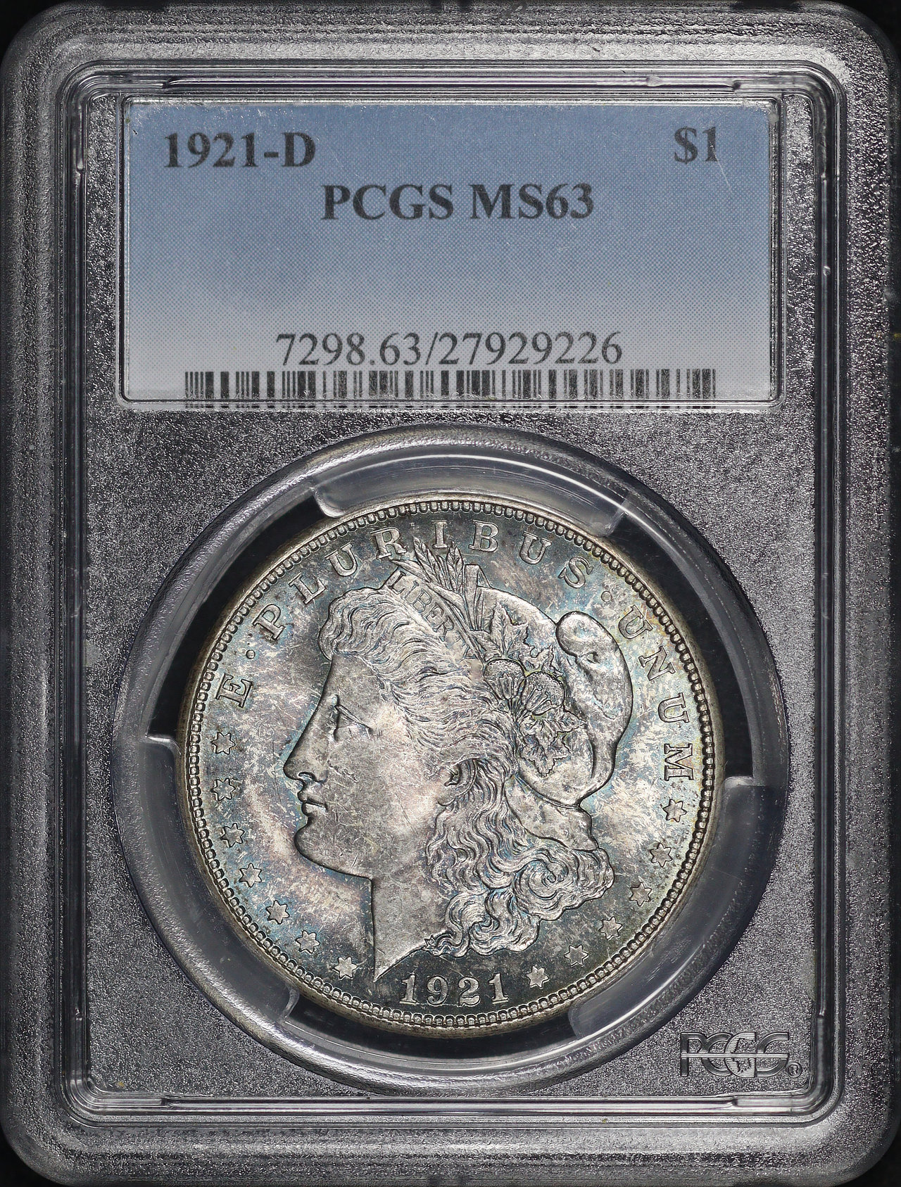 1921-D Morgan Dollar PCGS MS-63 designed by George T. Morgan. Both sides display stunning, deep blue toning!