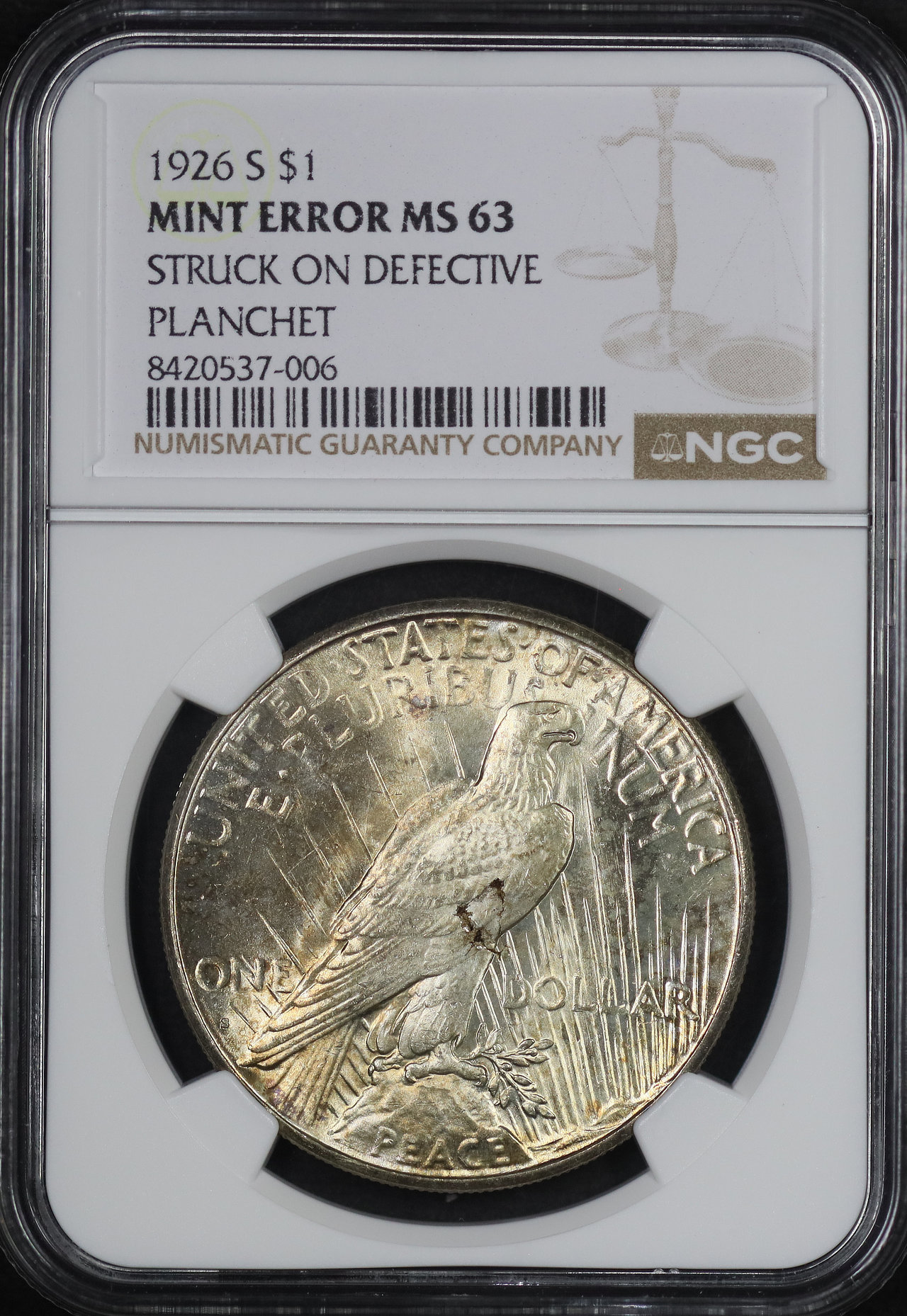 1926-S Peace Dollar NGC MS-63 Struck On Defective Planchet Mint Error