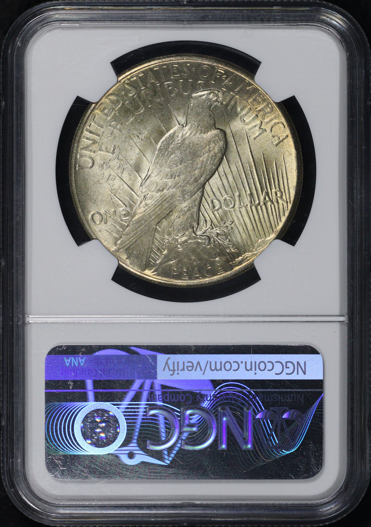 1928 Peace Dollar NGC MS-65+. Both sides display light gold toning.