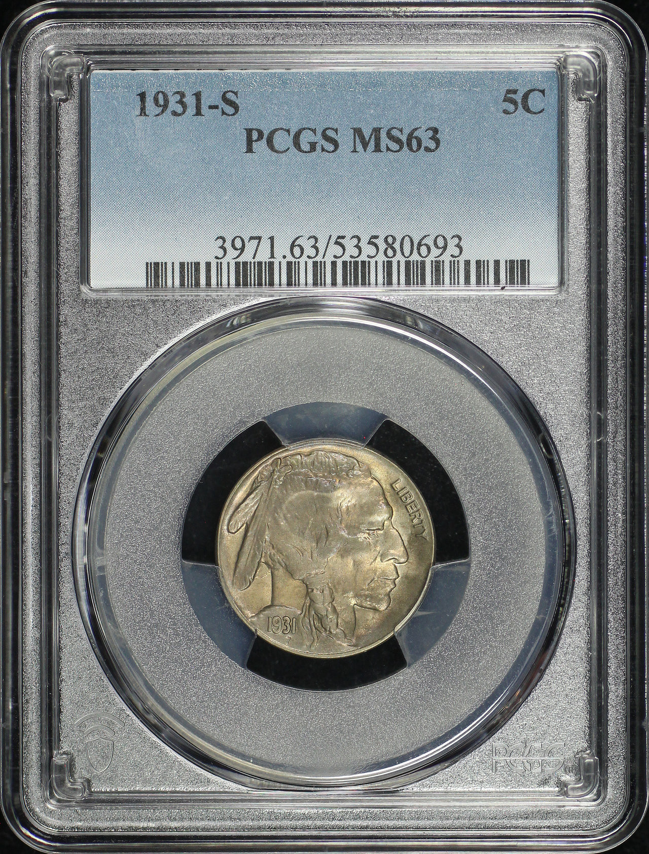 1931-S Buffalo Nickel PCGS MS-63 designed by James Earle Fraser. Both sides display dark amber hue toning.