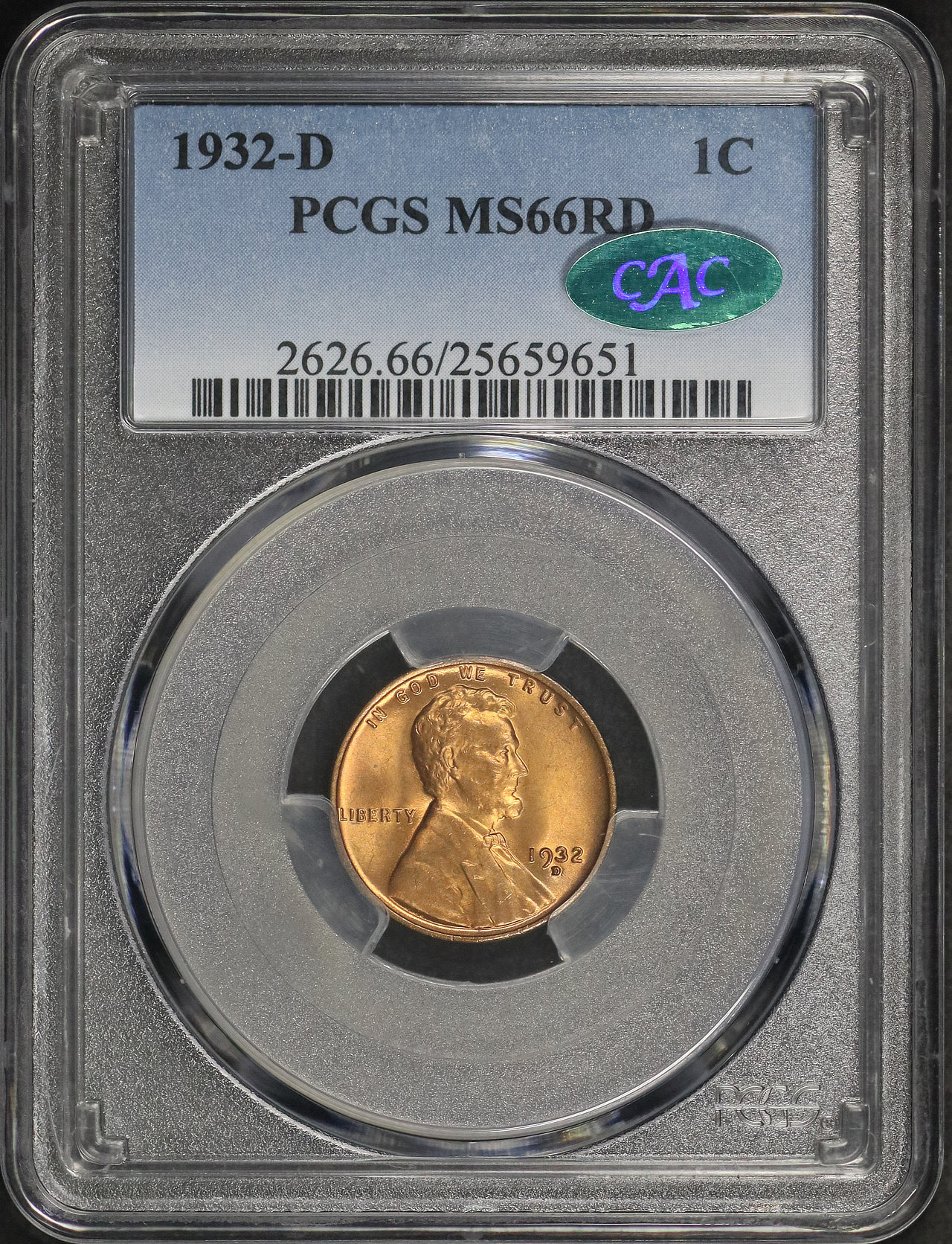 1932-D Lincoln Cent Wheat Reverse PCGS MS-66 RD CAC designed by Victor David Brenner.