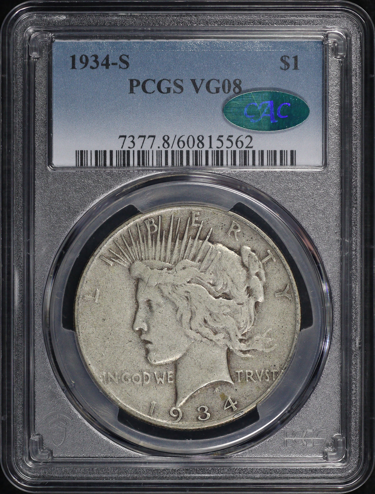 1934-S Peace Dollar PCGS VG-08 CAC designed by Anthony de Francisci.