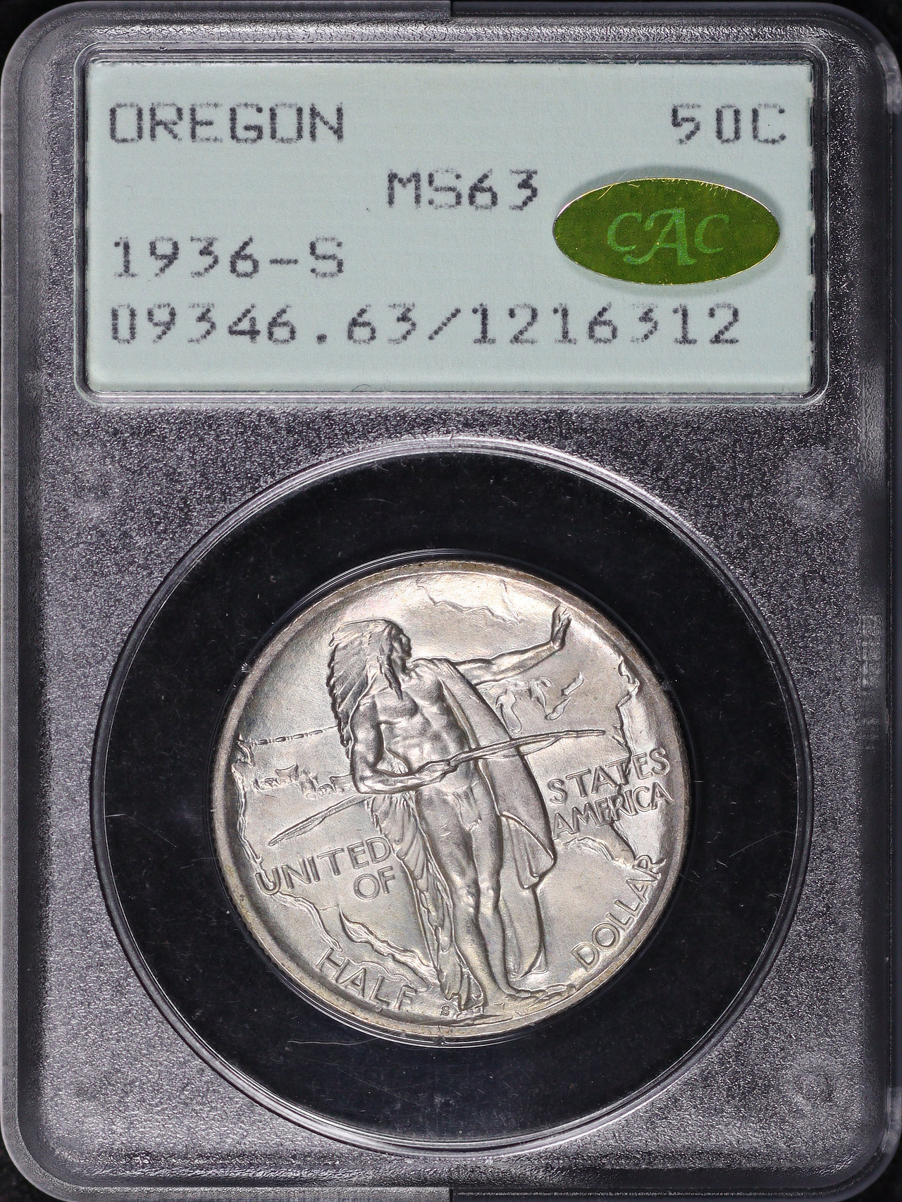 1936-S 50C Oregon Silver Commemorative PCGS MS-63 Gold CAC Old Green Rattler Holder