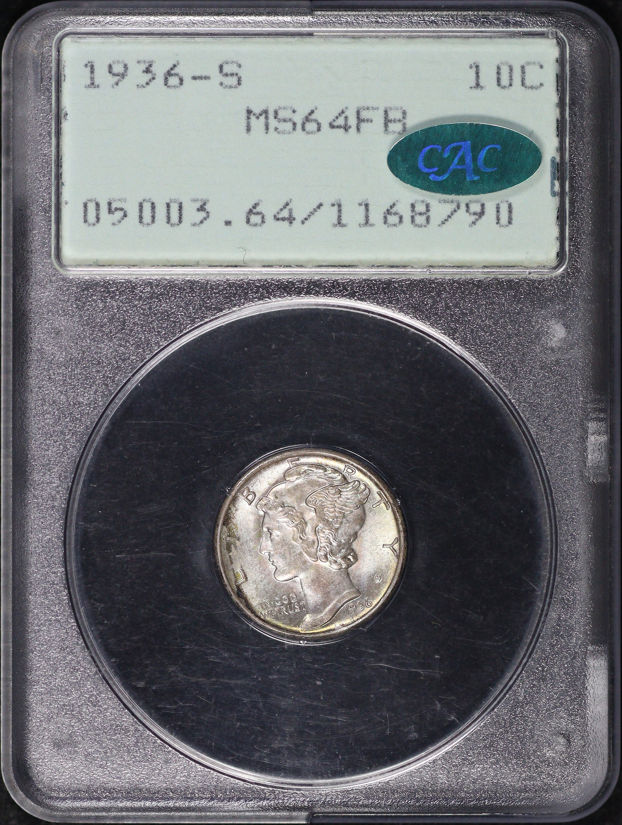 1936-S Mercury Dime PCGS MS-64 FB CAC Old Green Rattler Holder