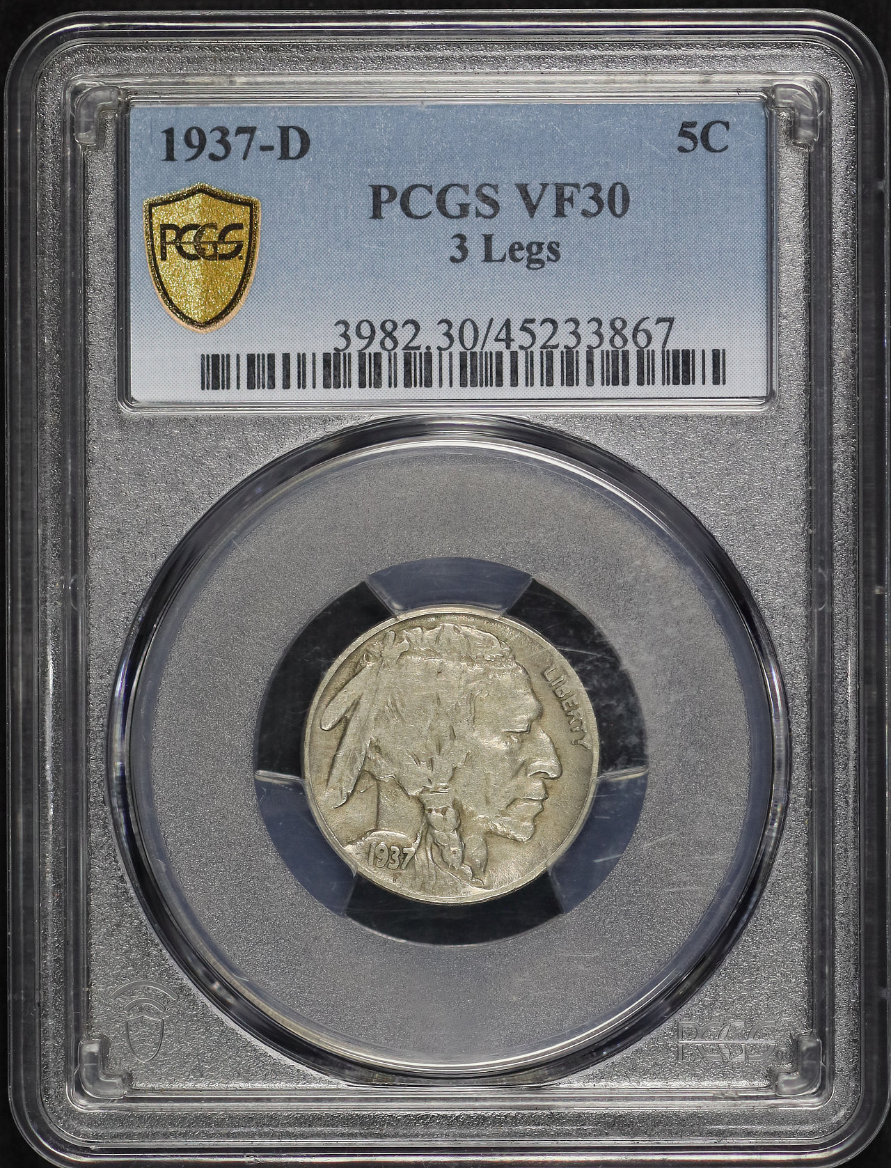 1937-D Buffalo Nickel 3 Legs PCGS VF-30 designed by James Earle Fraser.