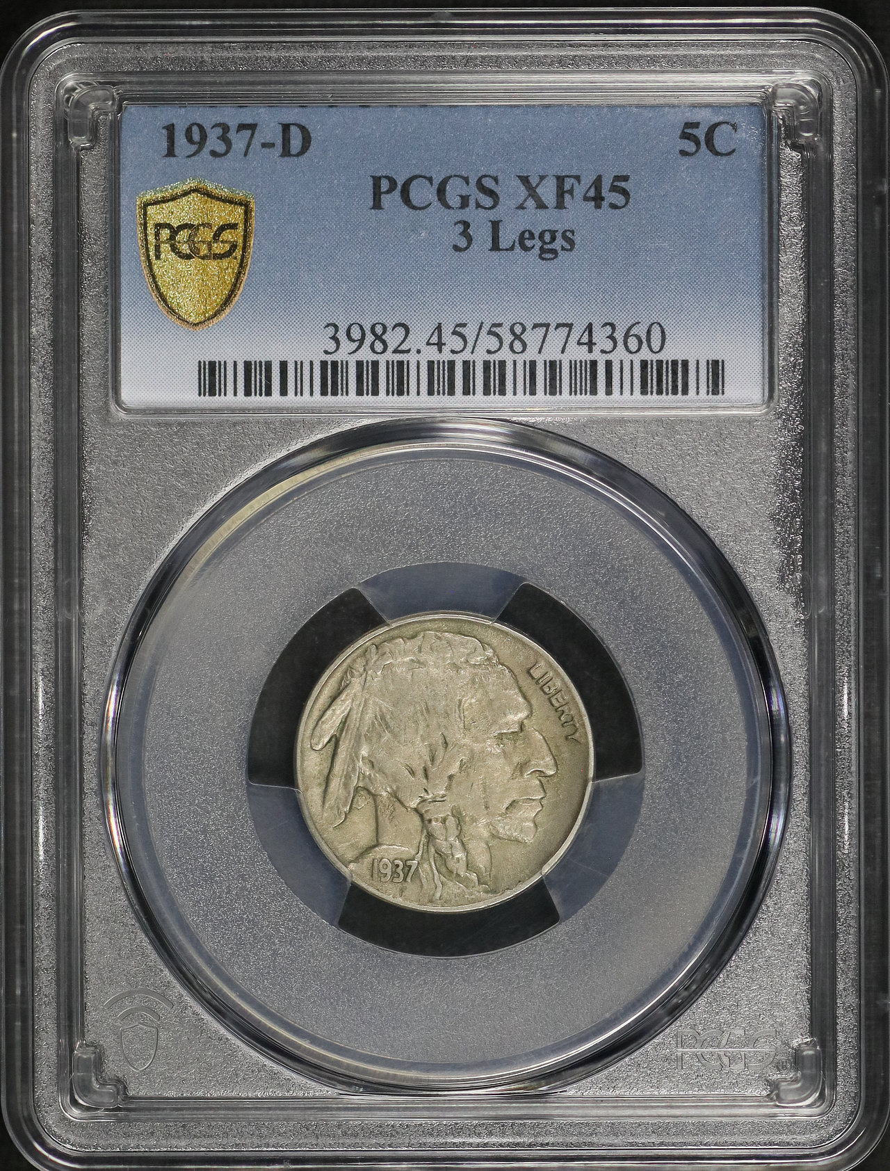 1937-D Buffalo Nickel 3 Legs PCGS XF-45 designed by James Earle Fraser.