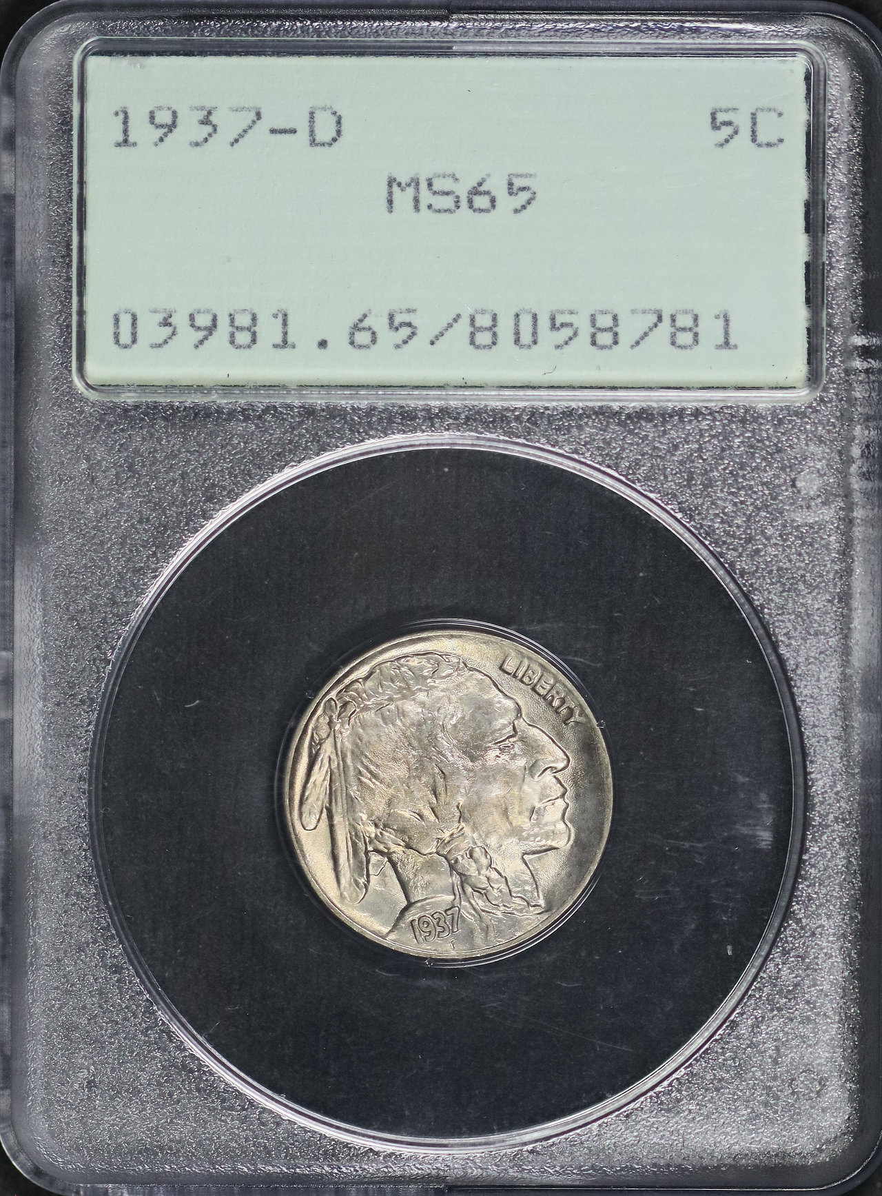 1937-D Buffalo Nickel PCGS MS-65 Old Green Rattler Holder designed by James Earle Fraser.
