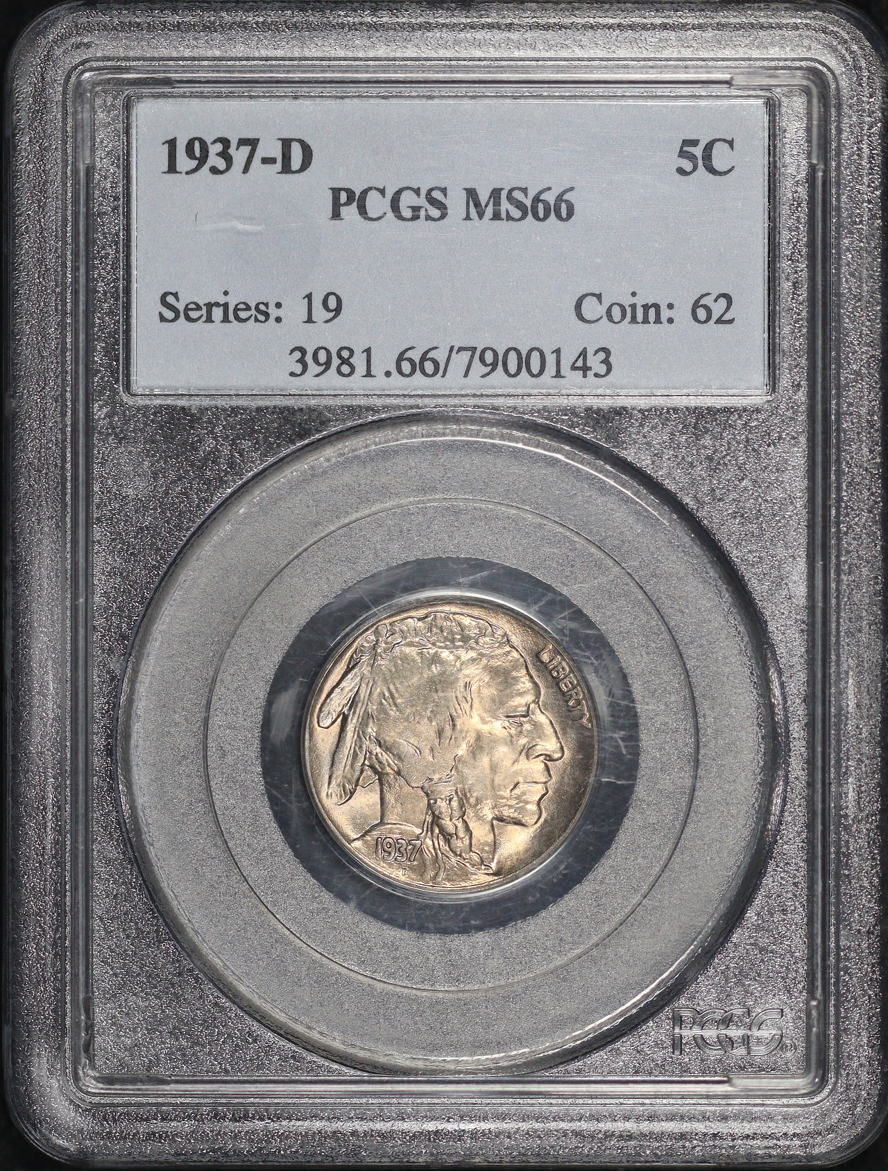 1937-D Buffalo Nickel PCGS MS-66 designed by James Earle Fraser. Both sides display faint gold toning. There are minor scuffs and scratches on the PCGS holder.