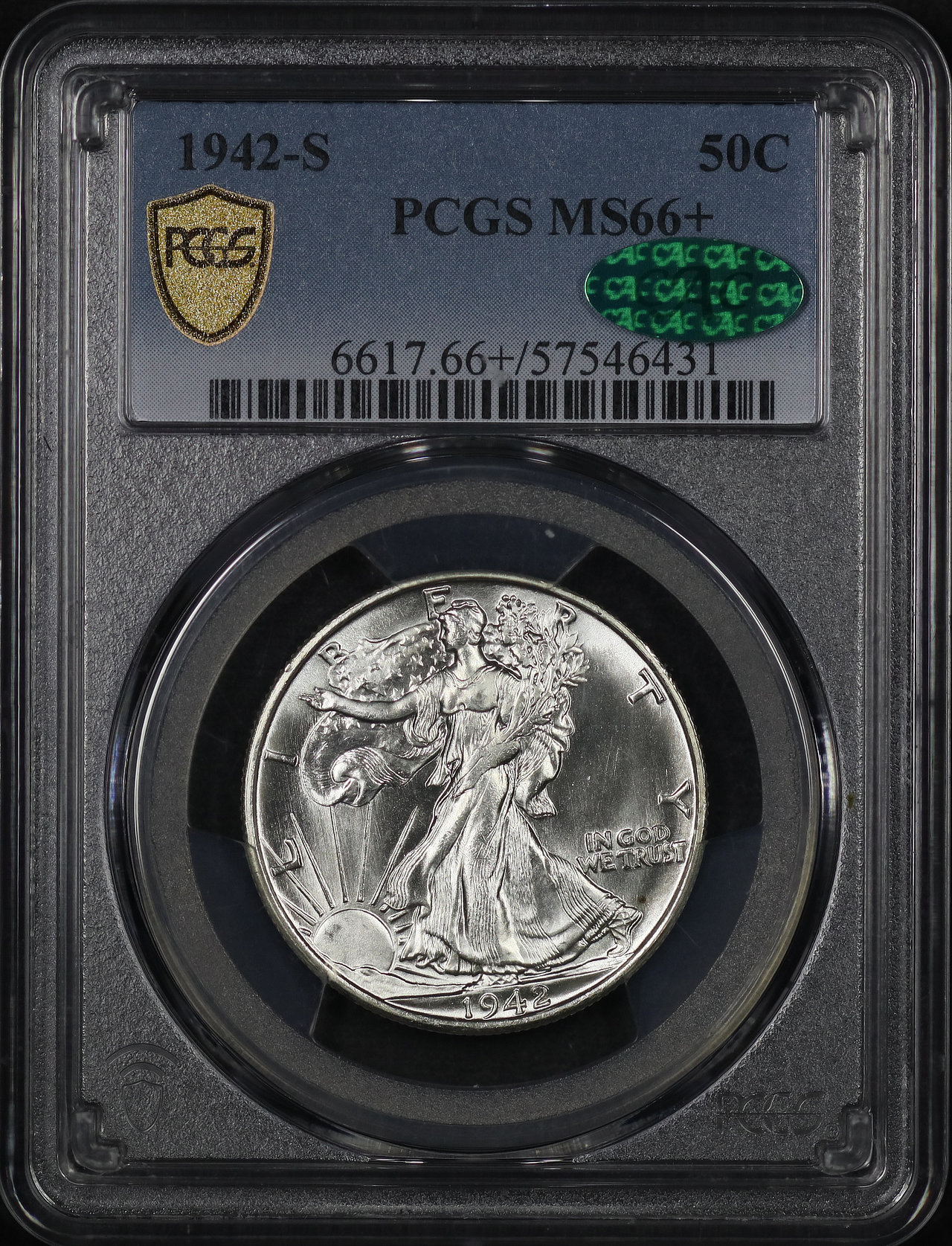 1942-S Walking Liberty Half Dollar PCGS MS-66+ CAC