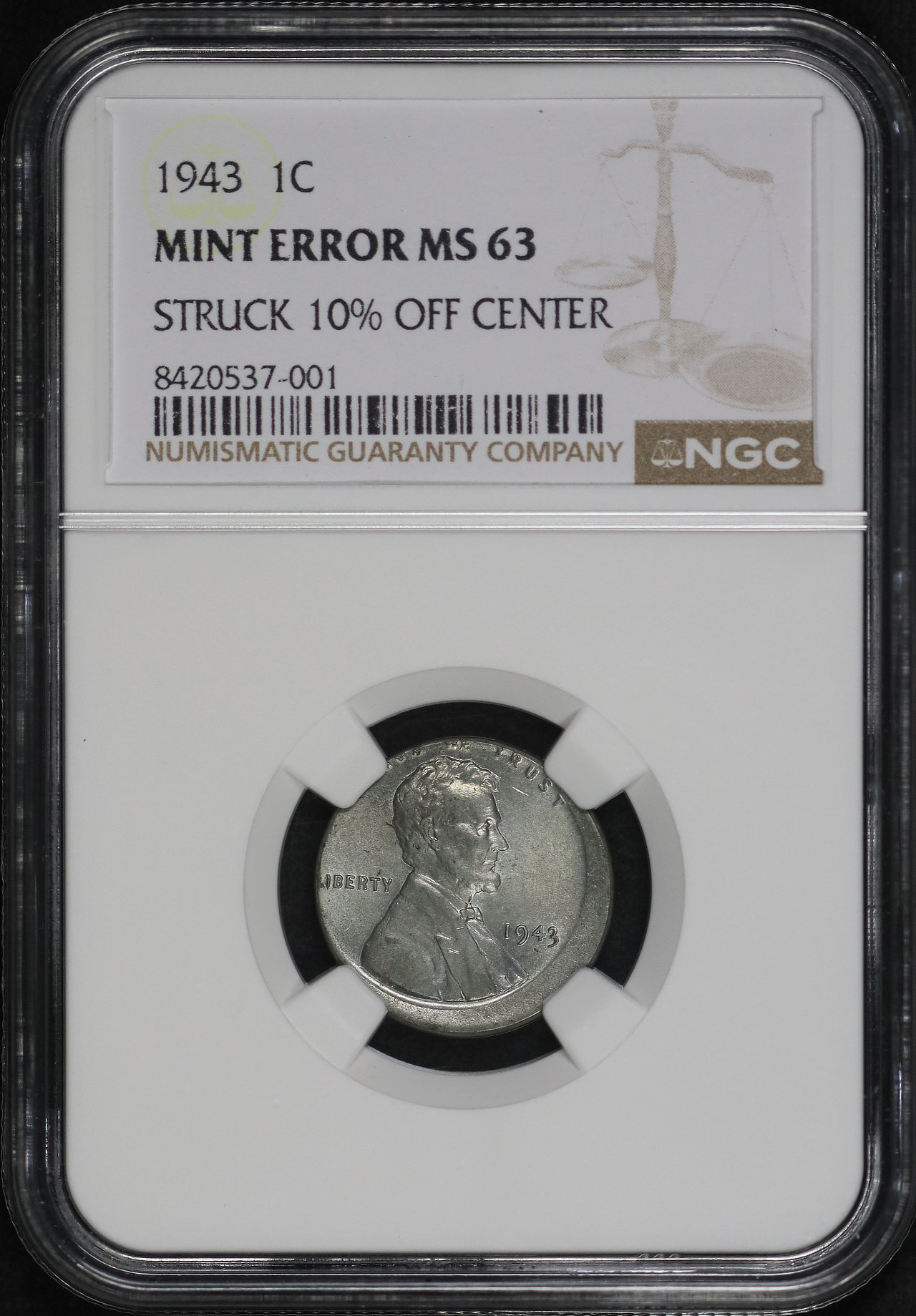 1943 Lincoln Cent Wheat Reverse NGC MS-63 Struck 10% Off Center Mint Error