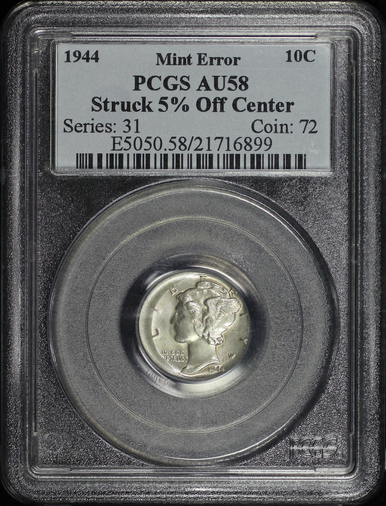 1944 Mercury Dime PCGS AU-58 Struck 5% Off Center Mint Error