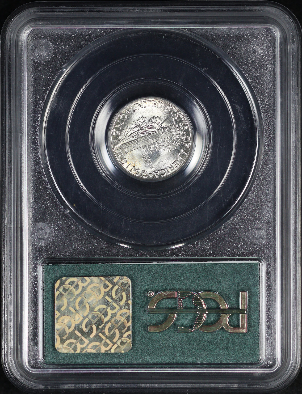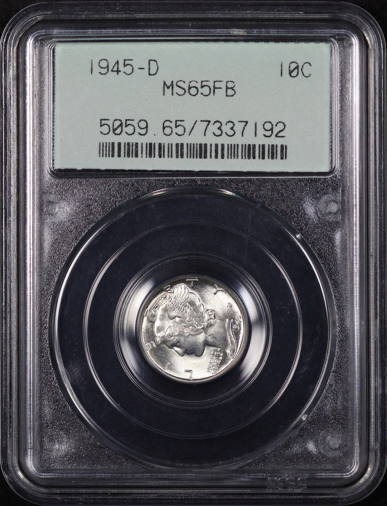 1945-D Mercury Dime PCGS MS-65 FB Old Green Gasket Holder designed by Adolph Alexander Weinman. There is some very faint orange/crimson hue toning on the reverse.