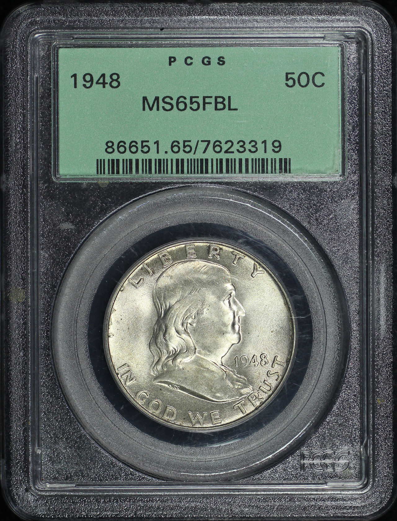 1948 Franklin Half Dollar PCGS MS-65 FBL Old Green Holder designed by John R. Sinnock and John Frederick Lewis.