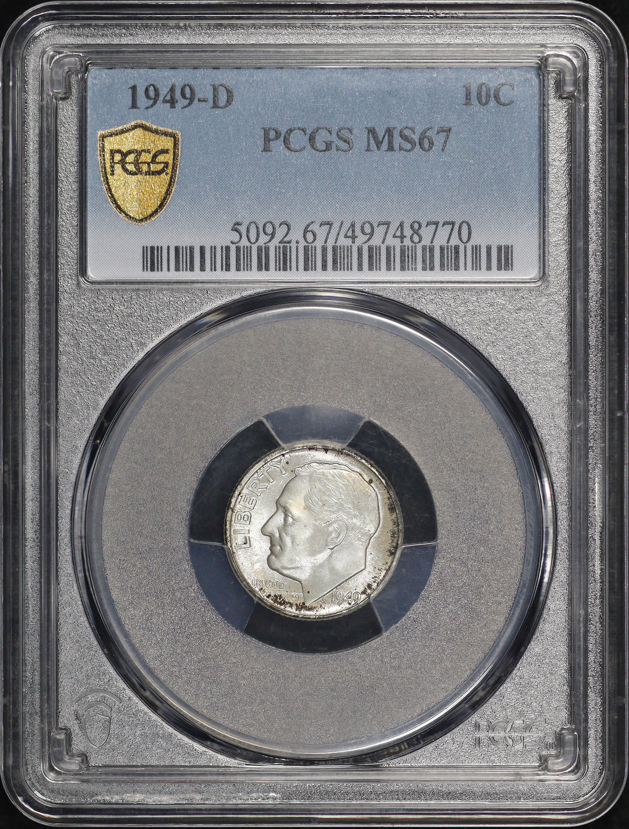 1949-D Roosevelt Dime PCGS MS-67 designed by John R. Sinnock. There is some spotty dark toning on the obverse.