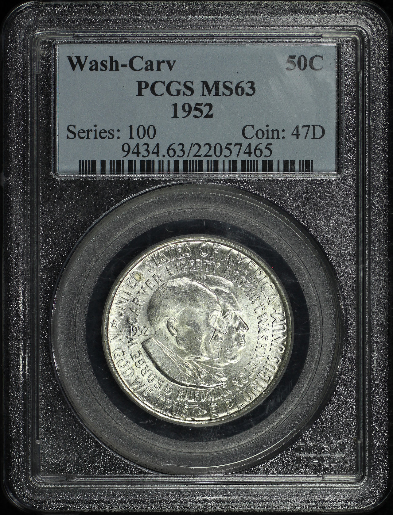 1952 50C Washington-Carver Silver Commemorative PCGS MS-63 designed by Isaac Scott Hathaway.