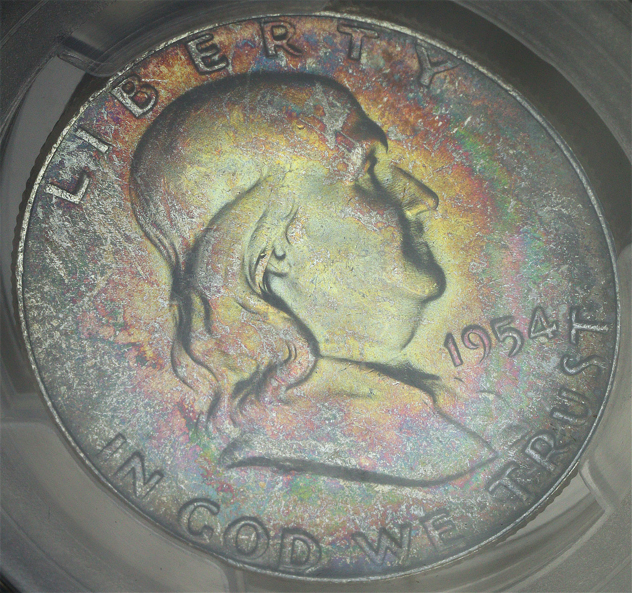 1954 Franklin Half Dollar “Bugs Bunny” FS-401 PCGS MS-67 Ruby’s Franklins – Vivid Toning