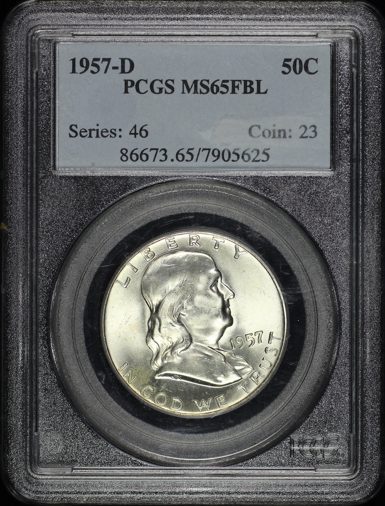 1957-D Franklin Half Dollar PCGS MS-65 FBL designed by John R. Sinnock and John Frederick Lewis.