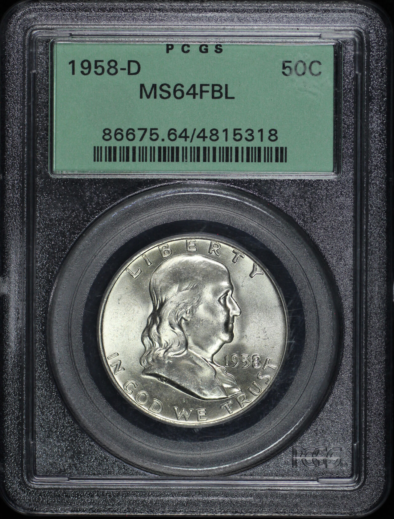 1958-D Franklin Half Dollar PCGS MS-64 FBL designed by John R. Sinnock and John Frederick Lewis.