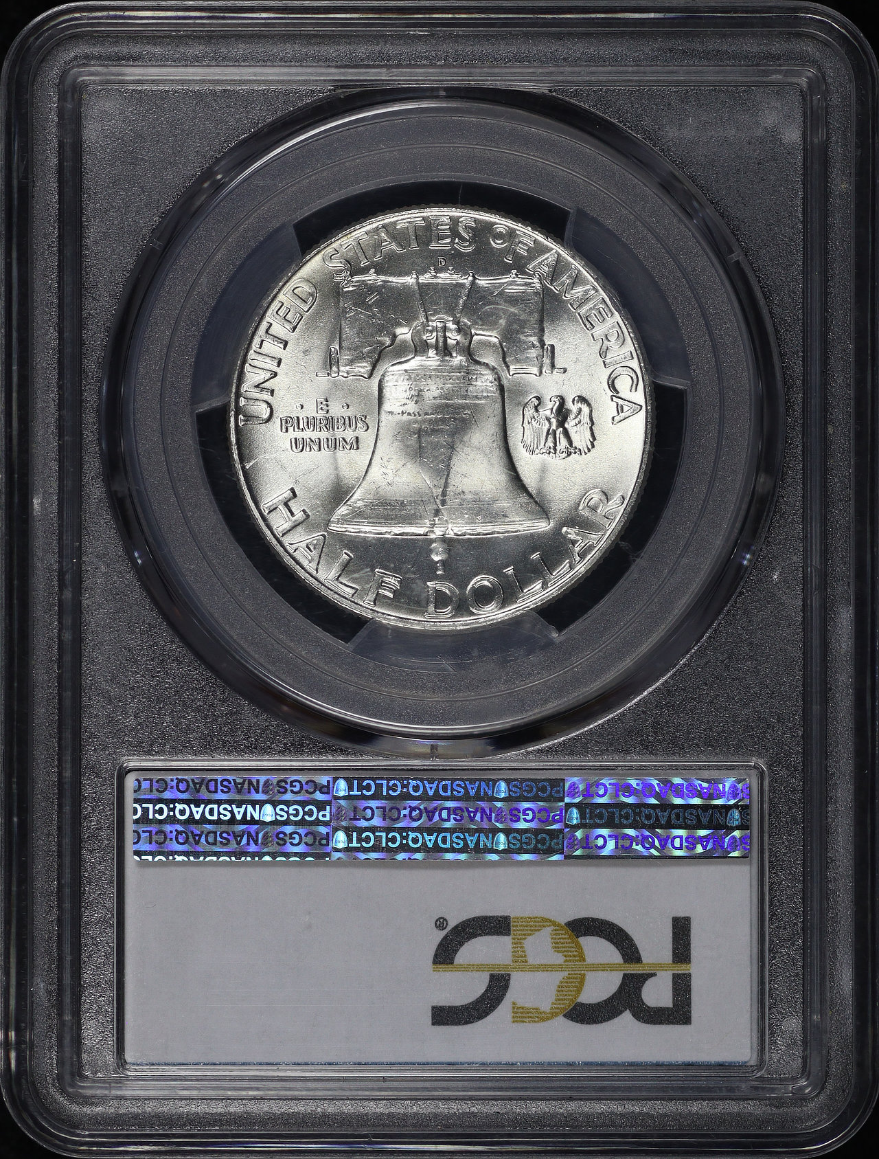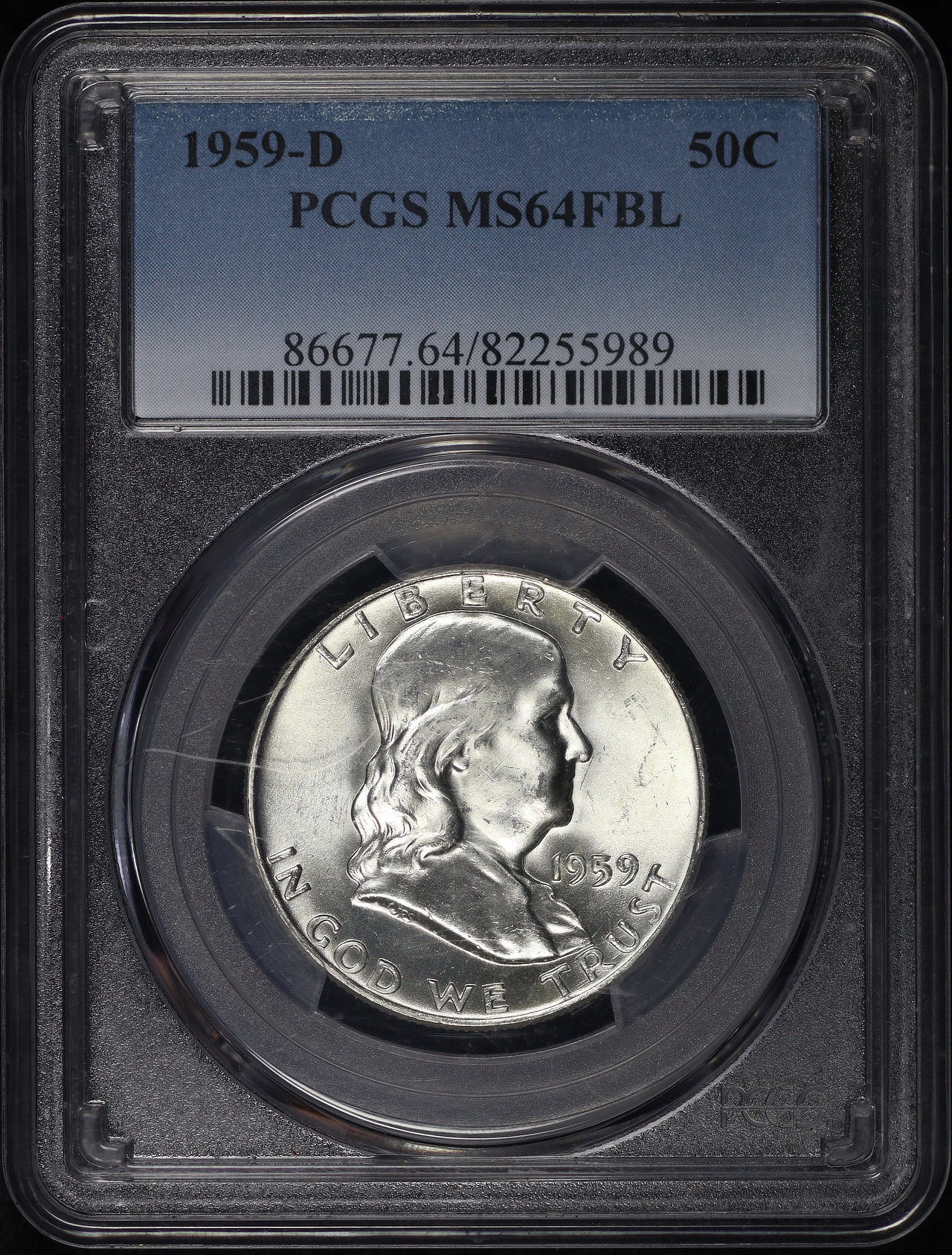 1959-D Franklin Half Dollar PCGS MS-64 FBL designed by John R. Sinnock and John Frederick Lewis.