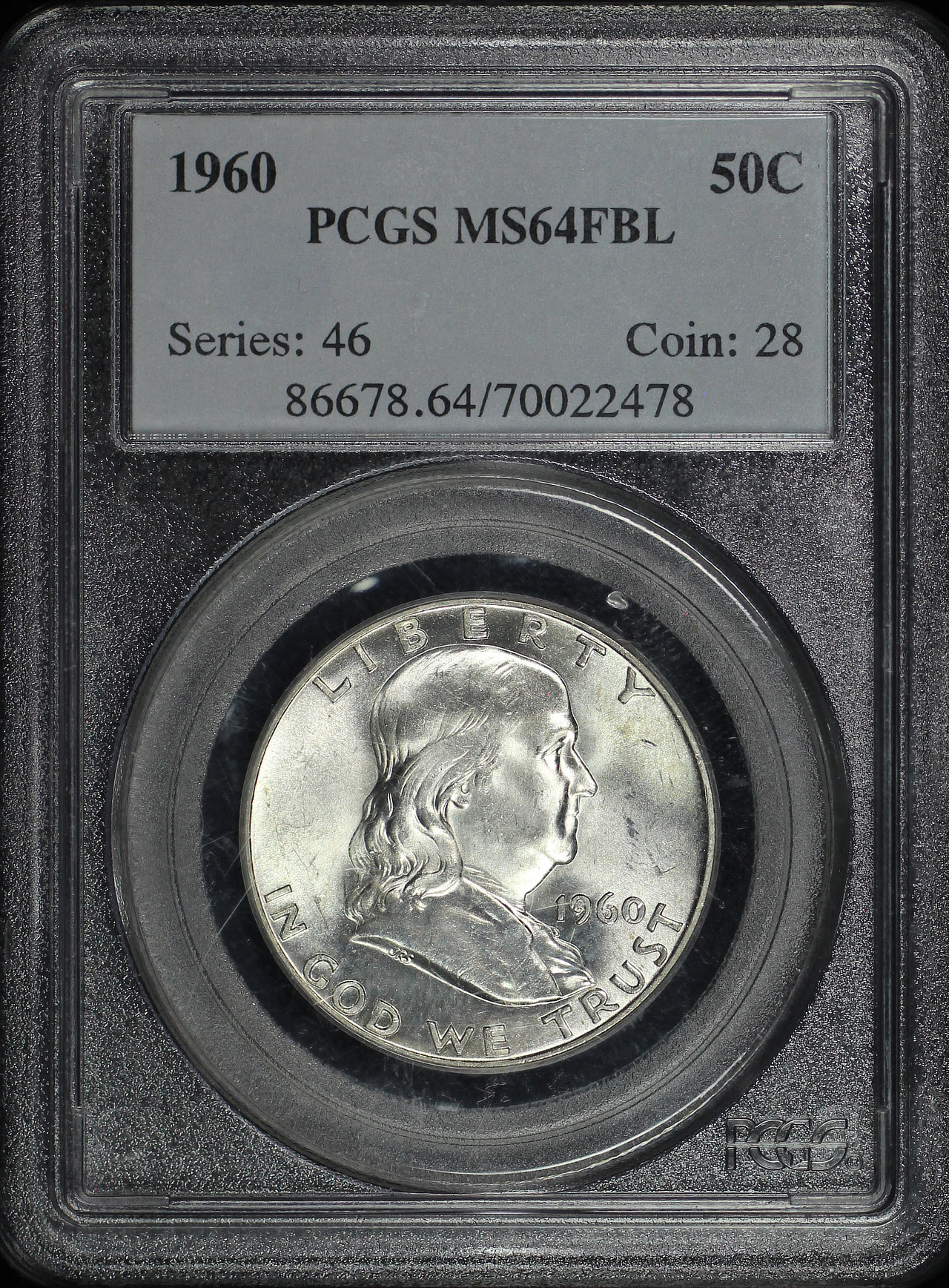 1960 Franklin Half Dollar PCGS MS-64 FBL designed by John R. Sinnock and John Frederick Lewis.