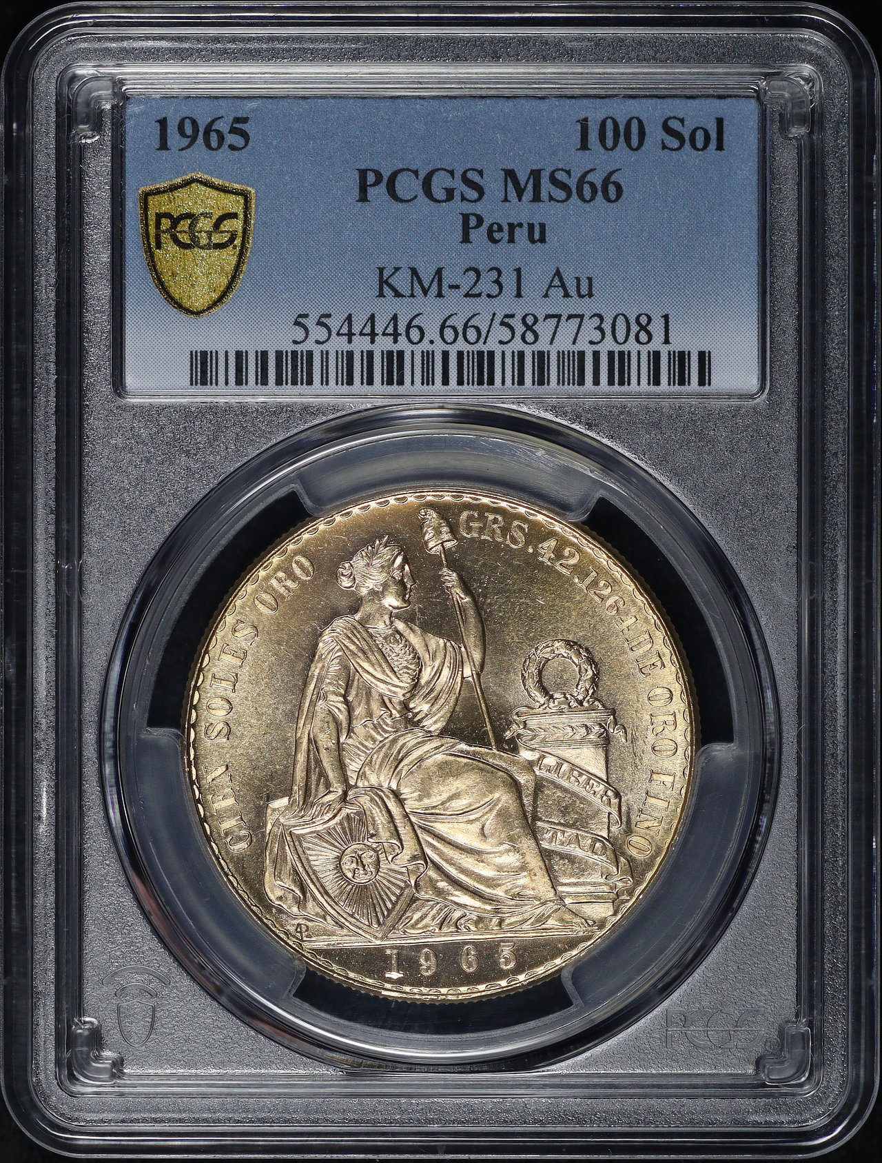 1965 Peru Gold 100 Soles Seated Liberty KM-231 Au PCGS MS-66. 1.3544 oz AGW.